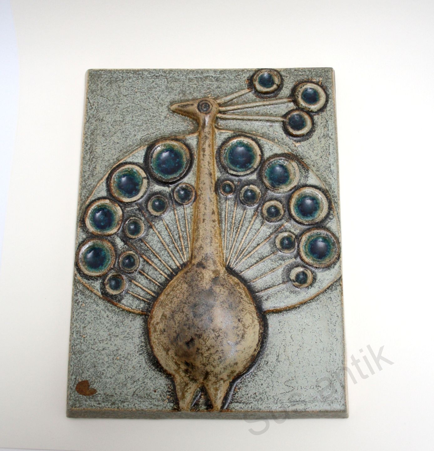 Søholm stentøj, Relief med påfugl designet af Joseph Simon. Nr. 8552. Længde 32 cm. Bredde 24 cm. Fin stand. Pris: SOLGT