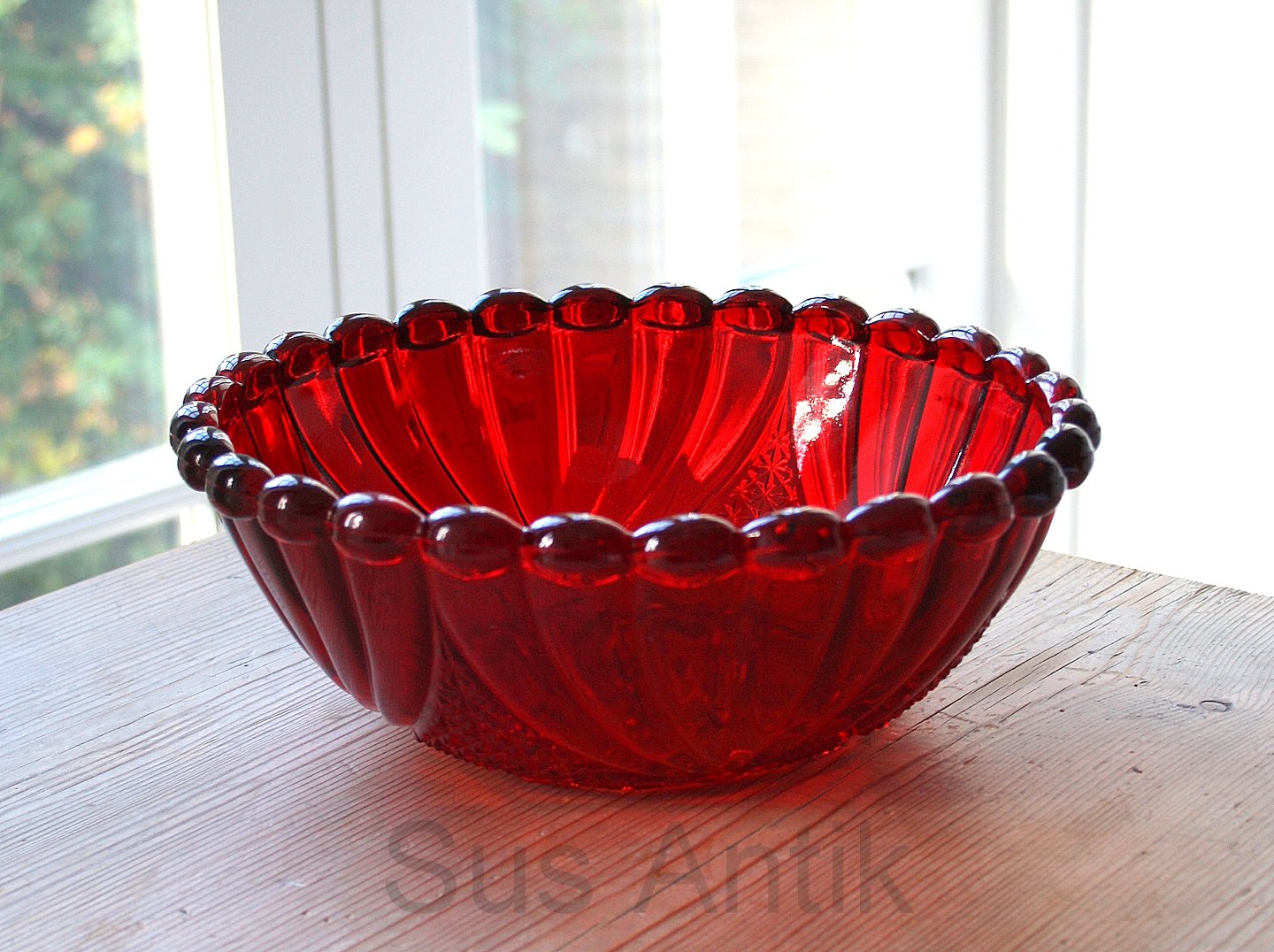 Fyens Glasværk, Rubinrød skål med orange nuance i presset glas fra 1924. Højde 8,5 cm. Diameter 23 cm. God stand. Pris: SOLGT