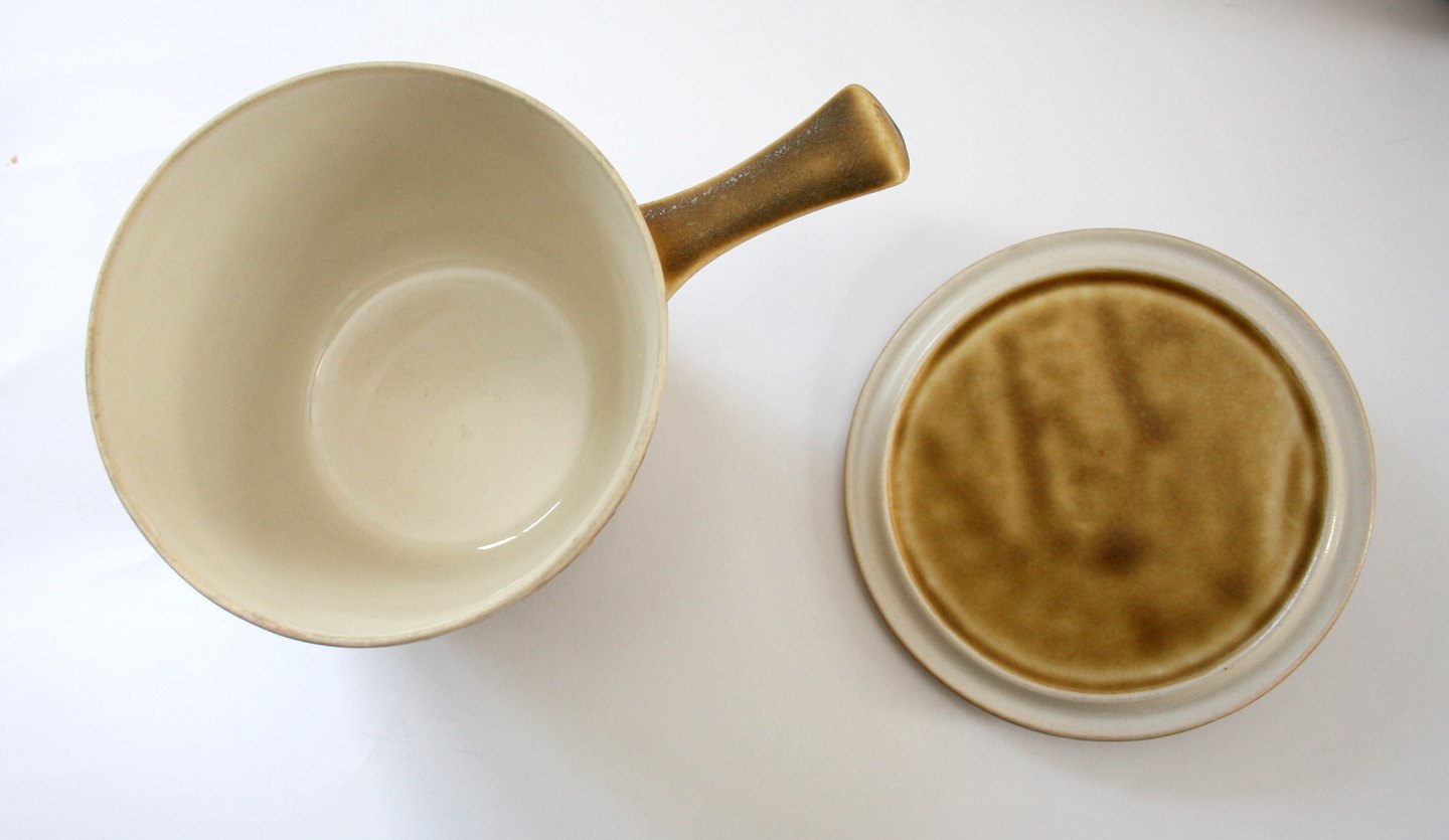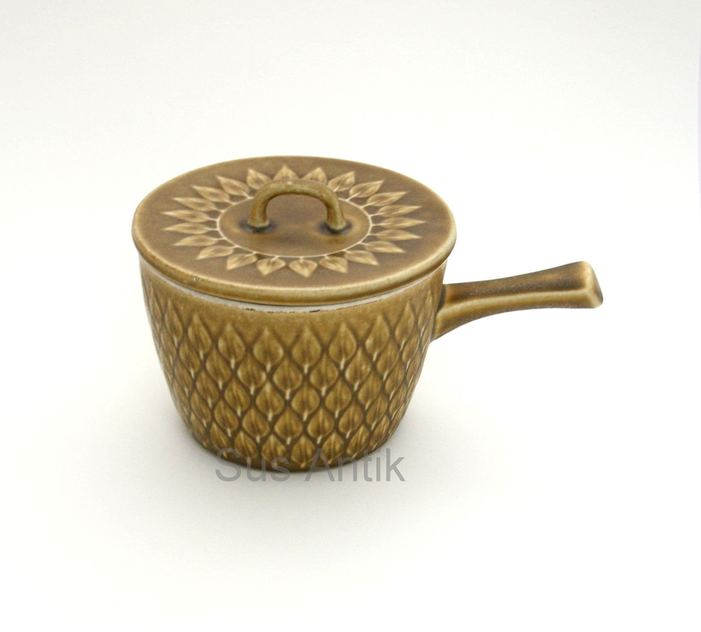 Kronjyden, Relief designet af Jens H Quistgaard 1958. Kasserolle med låg og hank. Højde 10 cm. Diameter 14 cm. Pris: SOLGT