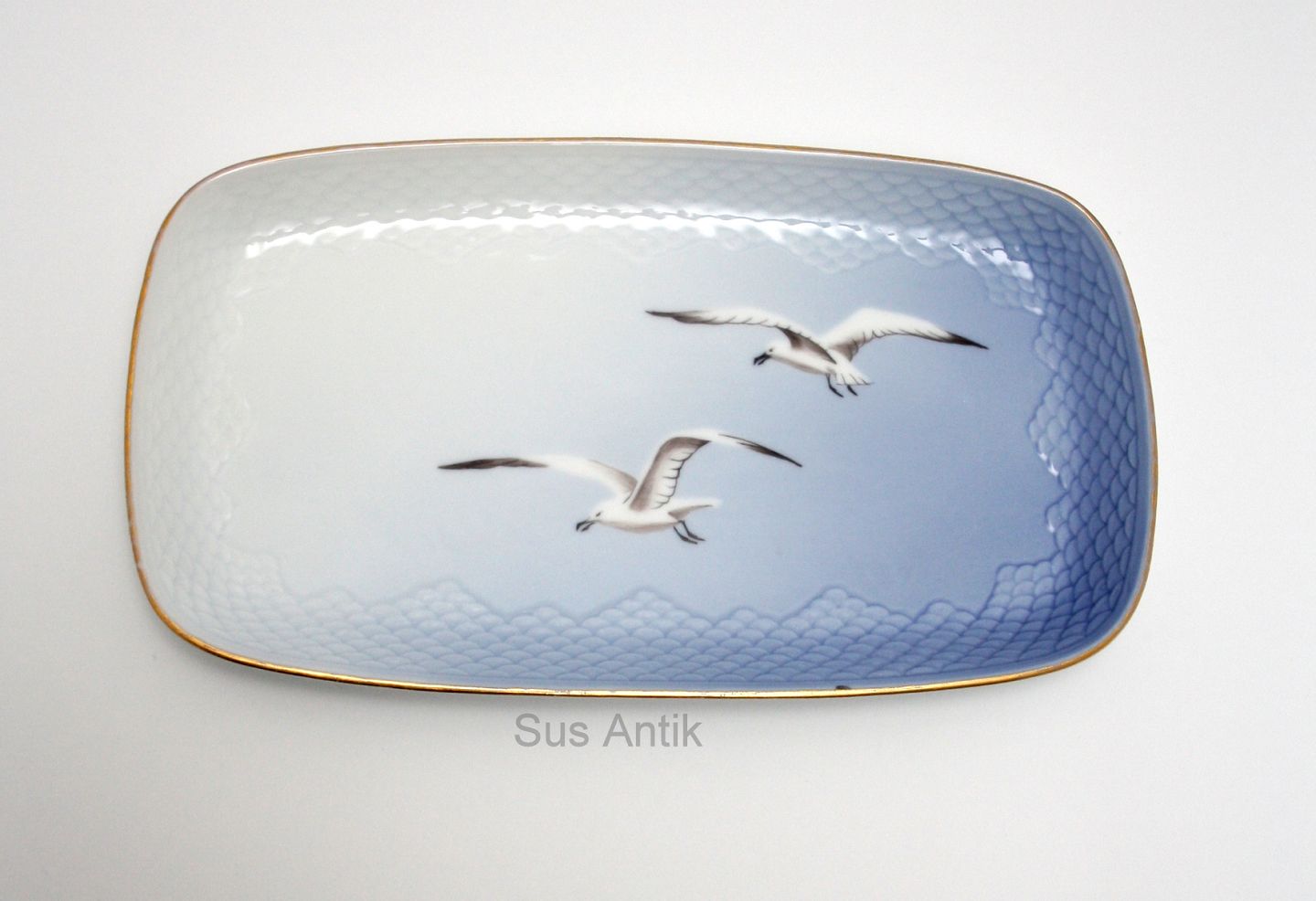 Bing & Grøndahl, Måge med guld. Bakke til sukker og fløde. Nr. 96. 27x15 cm. Pris: SOLGT