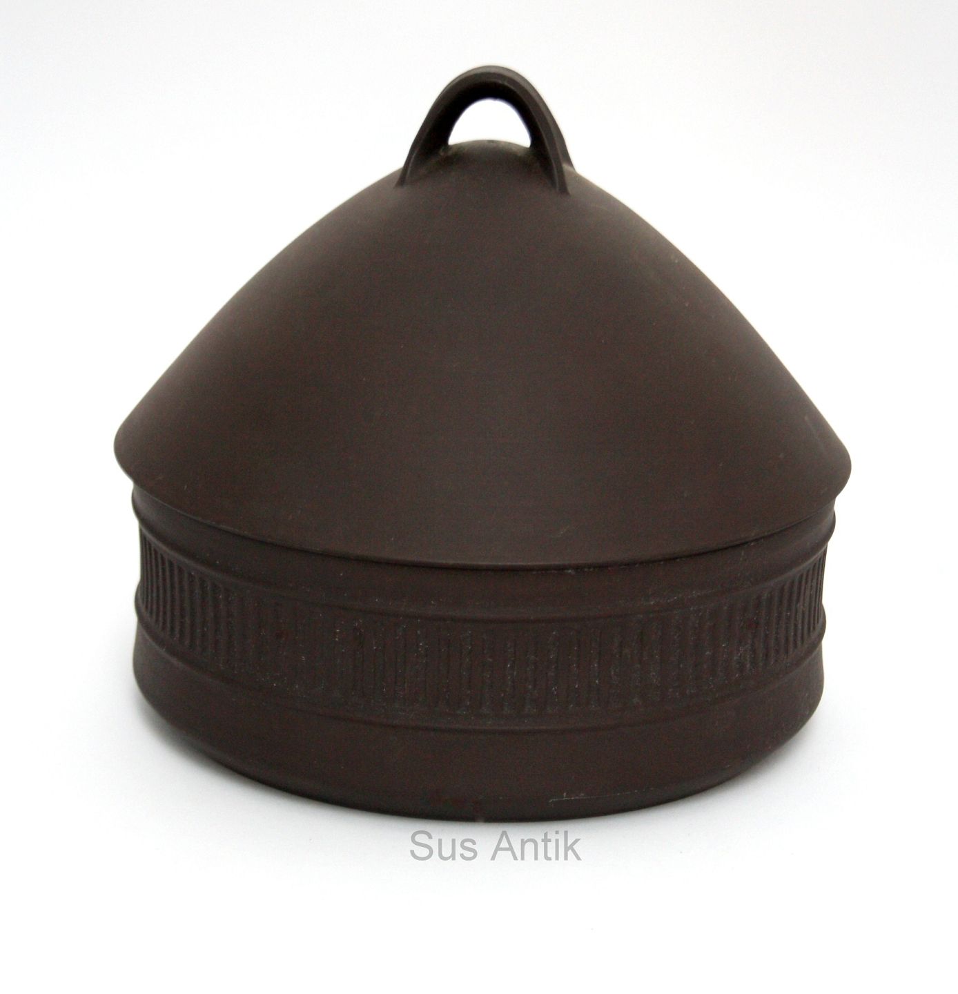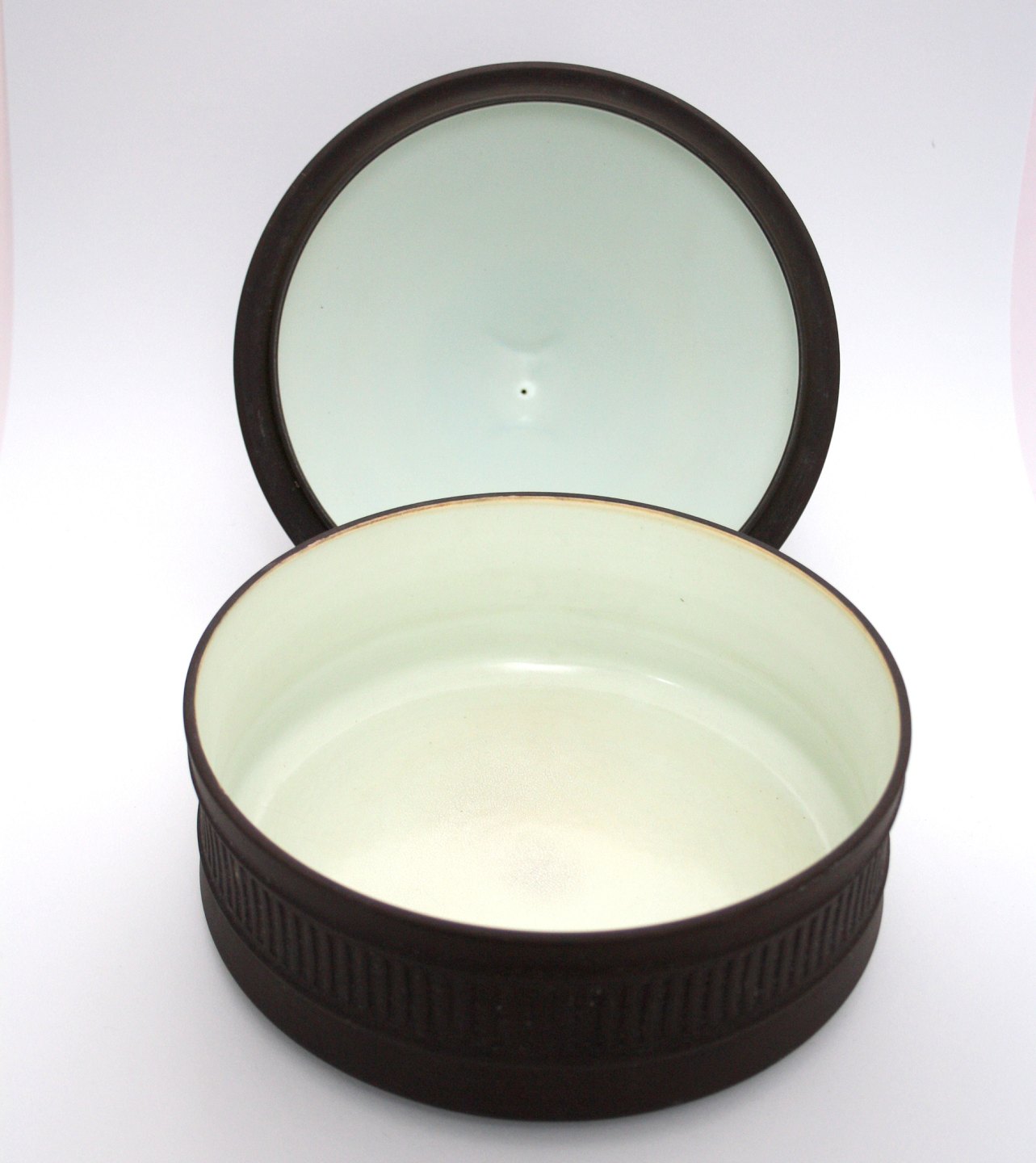 Eslau Danmark, Flamestone, Terrin med låg. Indvendig hvid glasur, yderside i rå uglaseret stentøj. Designet af Jens Harald Quistgaard i 1950,erne. Signeret IHQ, Dansk Designs, Denmark. Højde 19,5 cm. Diameter 21 cm. God stand. Pris: SOLGT