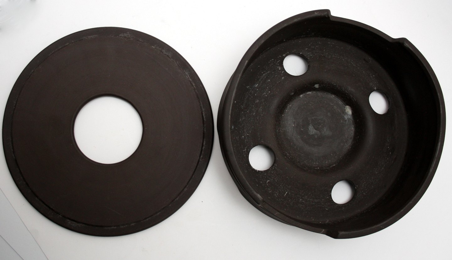 Eslau Danmark, Flamestone. Fyrfad. Indvendig hvid glasur, yderside i rå uglaseret stentøj. Designet af Jens Harald Quistgaard i 1950,erne. Signeret IHQ, Dansk Designs, Denmark. Højde 8 cm. Diameter 19,5 cm. Pris: SOLGT