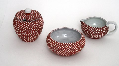 Aluminia fajance. Knud. Design Niels Thorsson. Håndmalet. Produceret i perioden 1934-1963. Tekande med låg. Højde 12 cm. Diameter 15,5 cm. Længde 25,5 cm. Lettere overfladekrakelering udvendig. Brun krakelering indvendig. Lille glasurafslag under tuden yderst. Pris: SOLGT
