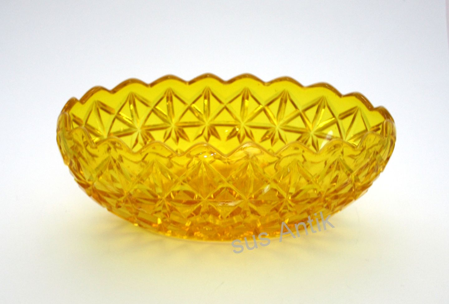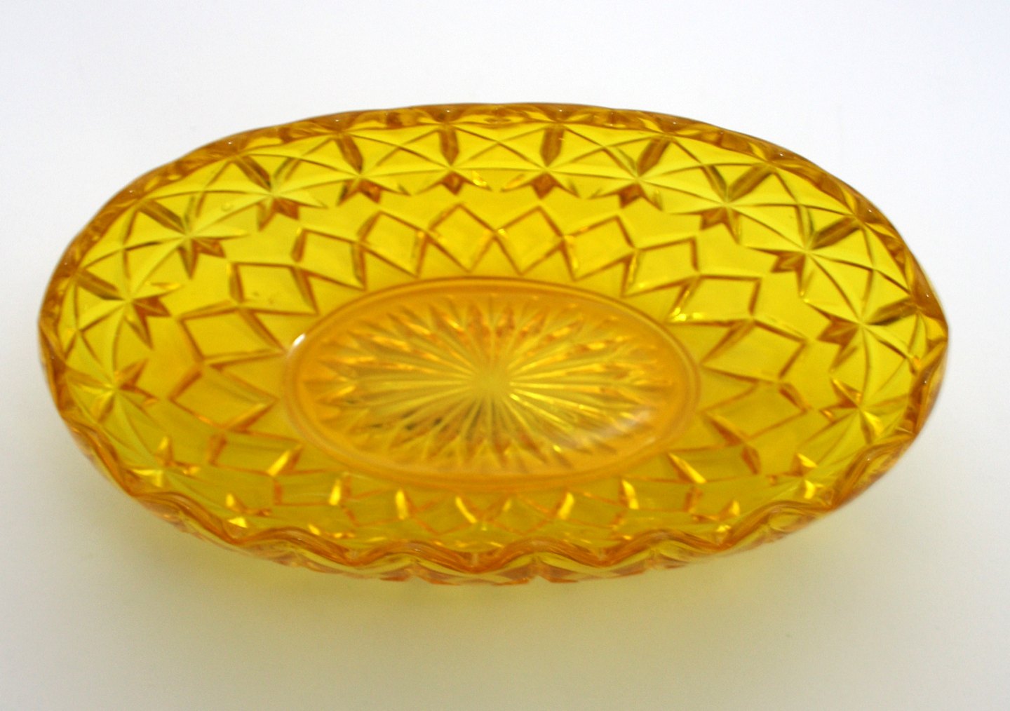 Fyens Glasværk, Limegrøn presset glas med krydsslibning. Produceret fra 1924 og frem. Jardiniere (oval skål). Længde 23 cm. Bredde 12 cm. Højde 9 cm. Pris: SOLGT