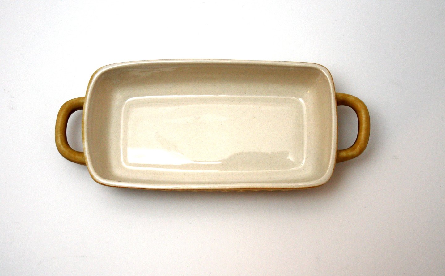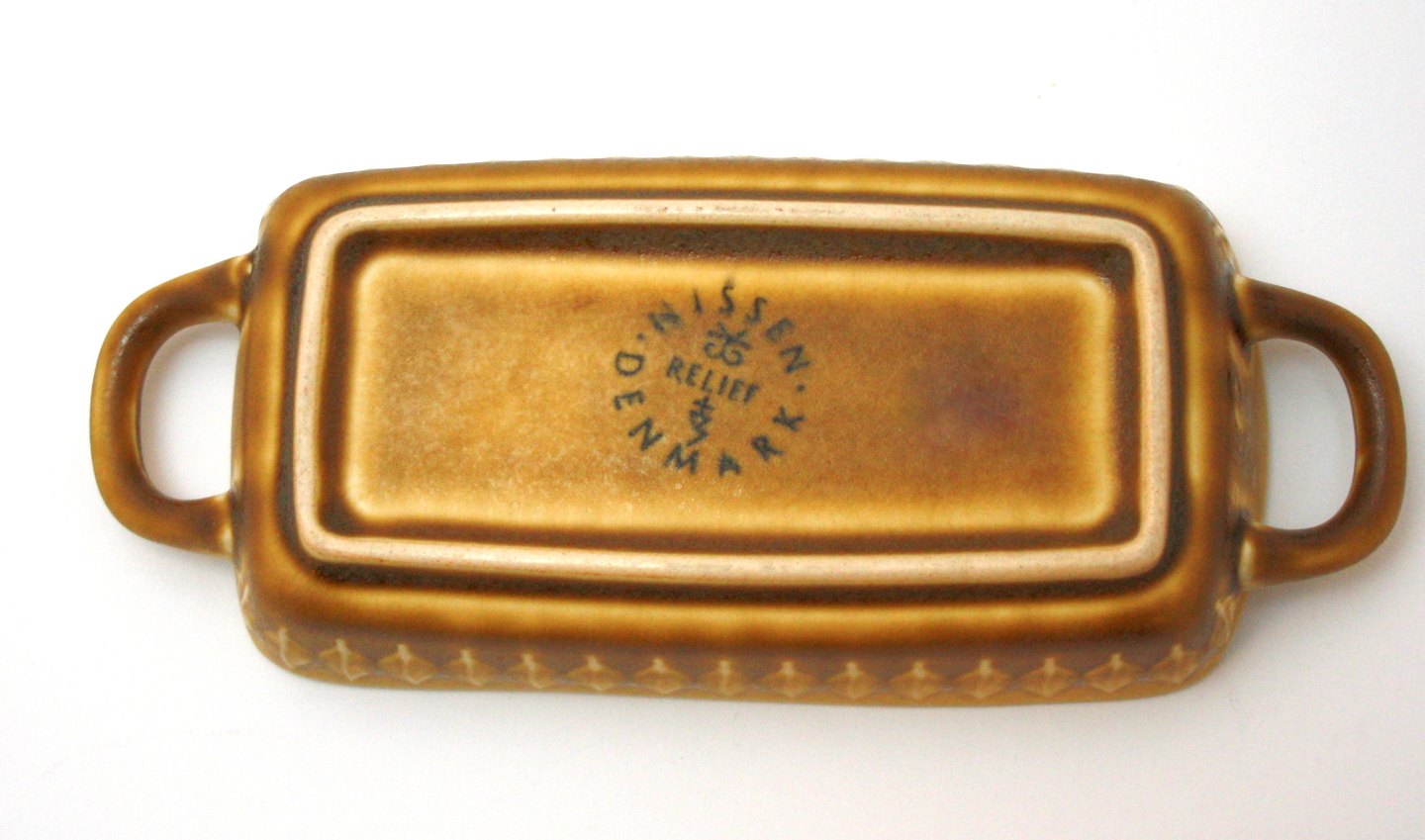 Nissen, Relief designet af Jens H Quistgaard 1958. Aflang serveringsskål med ører. Hvid glasur indvendig. Findes også uglasseret. Længde 19 cm. Bredde 8 cm. Højde 3,5 cm. Pris: SOLGT