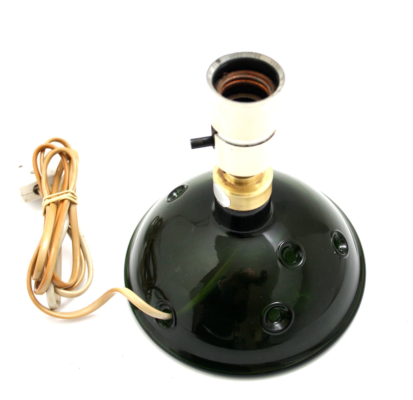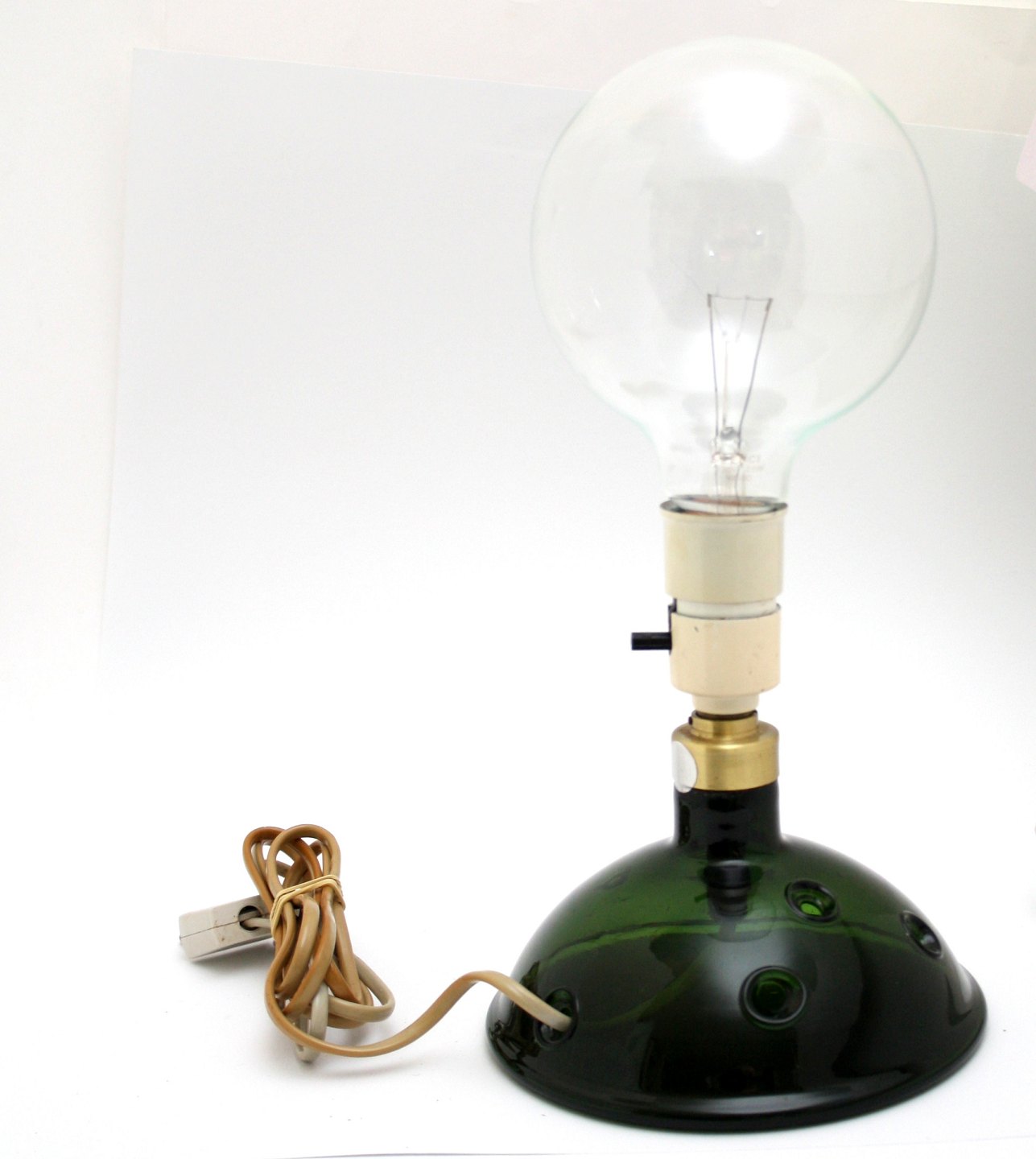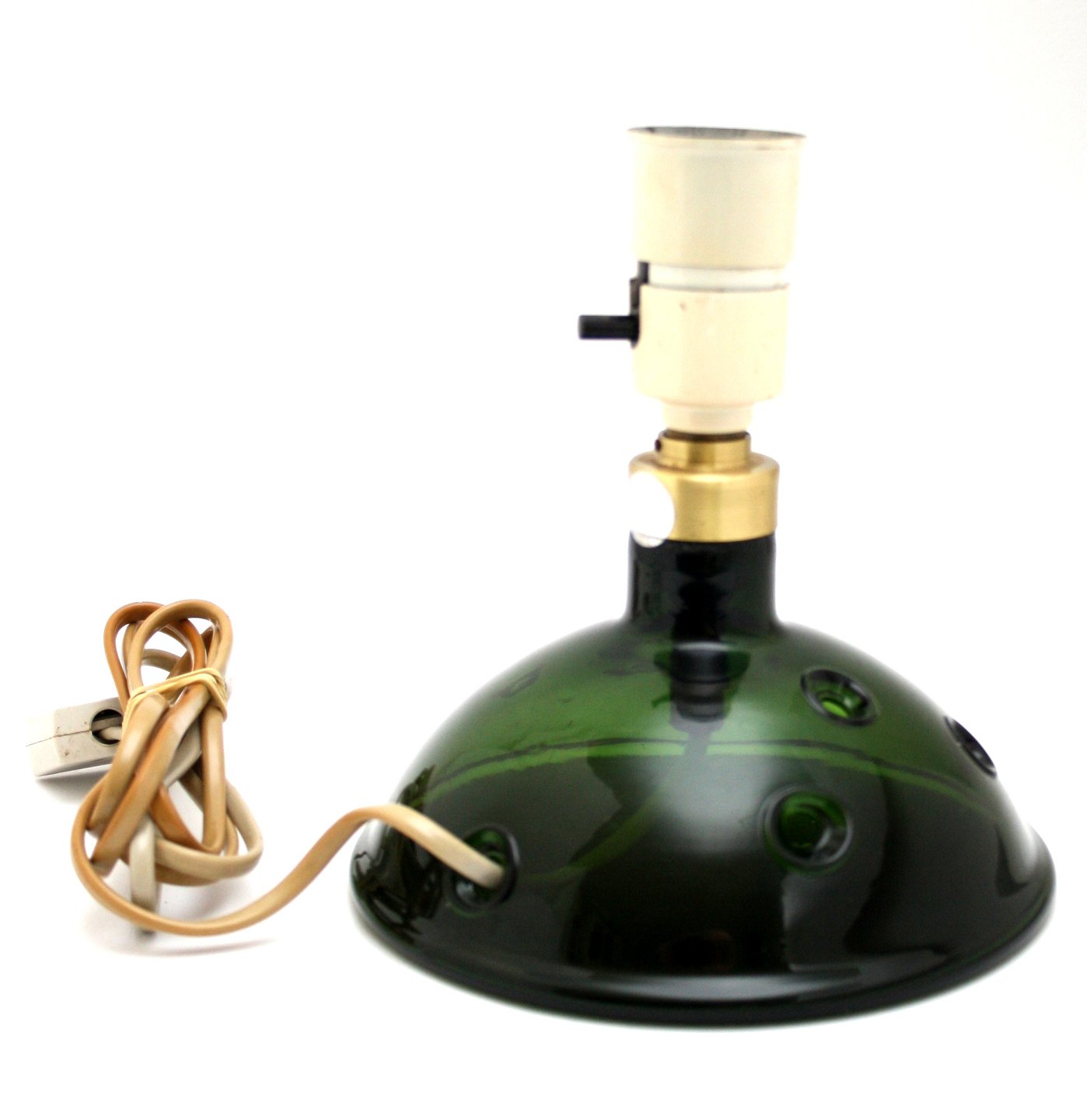 Holmegaard, Meteor bordlampe model A lav med 5 huller. Designet af Michael Bang i 1974. Udgået af produktion 1981. Højde incl. fatning 18 cm. Diameter bund 16 cm. Der er lidt snavs i bunden pga hullerne.