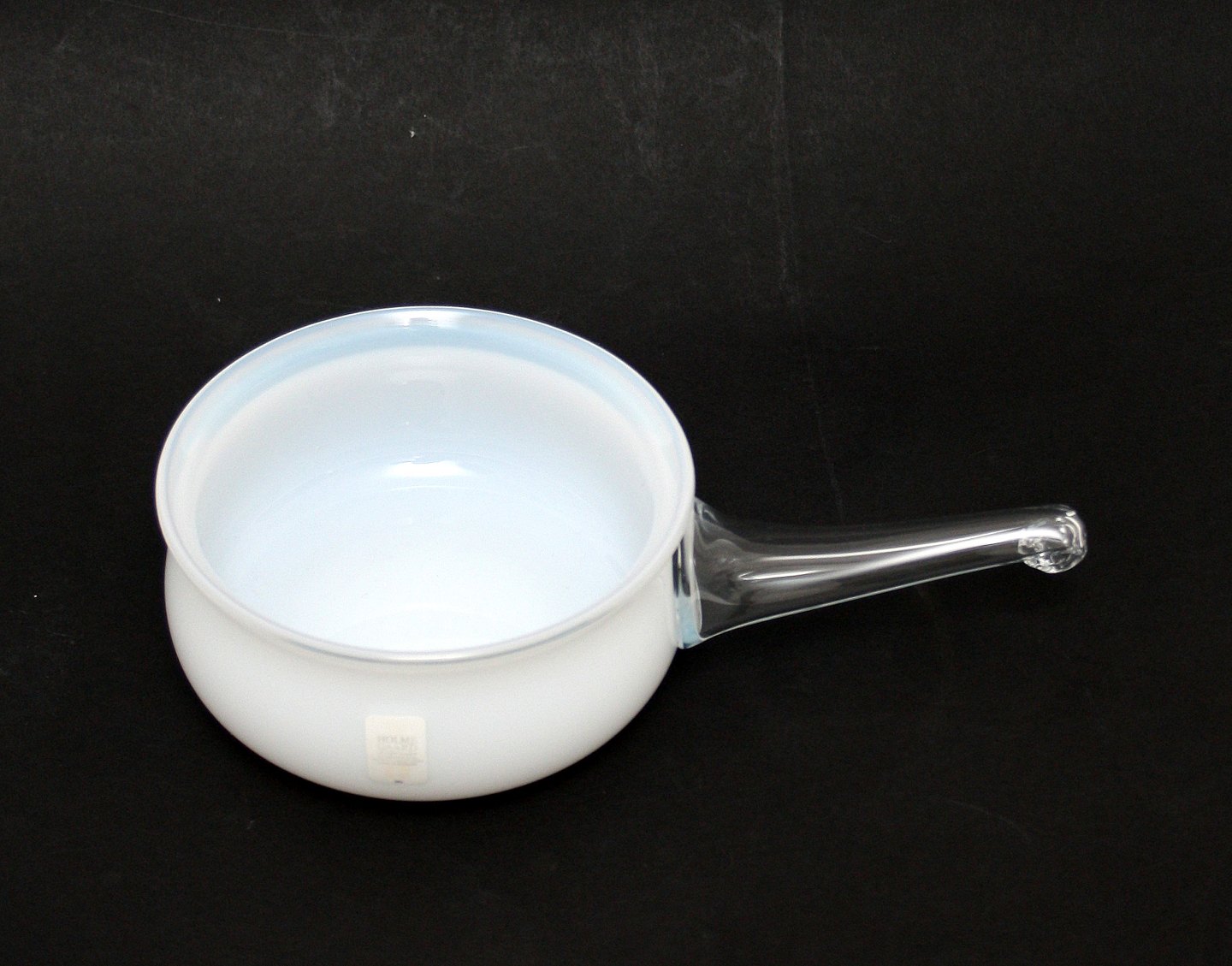Holmegaard, Etcetera, Skål opalhvid med klar hul håndtag. Designet af Michael Bang i 1970. Har lighed med Palet serien. Højde ca. 5 cm. Diameter 12 cm. Længde 21 cm. Pris: SOLGT