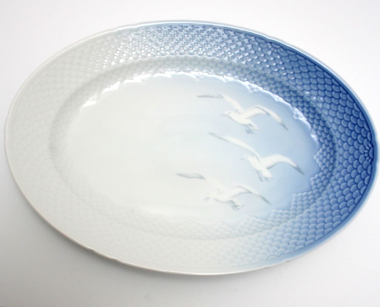 Bing & Grøndahl, Måge uden guld, Aflangt stegefad. Nr. 15. Længde 41 cm. Bredde 28,5 cm. II. sortering. Pris: SOLGT