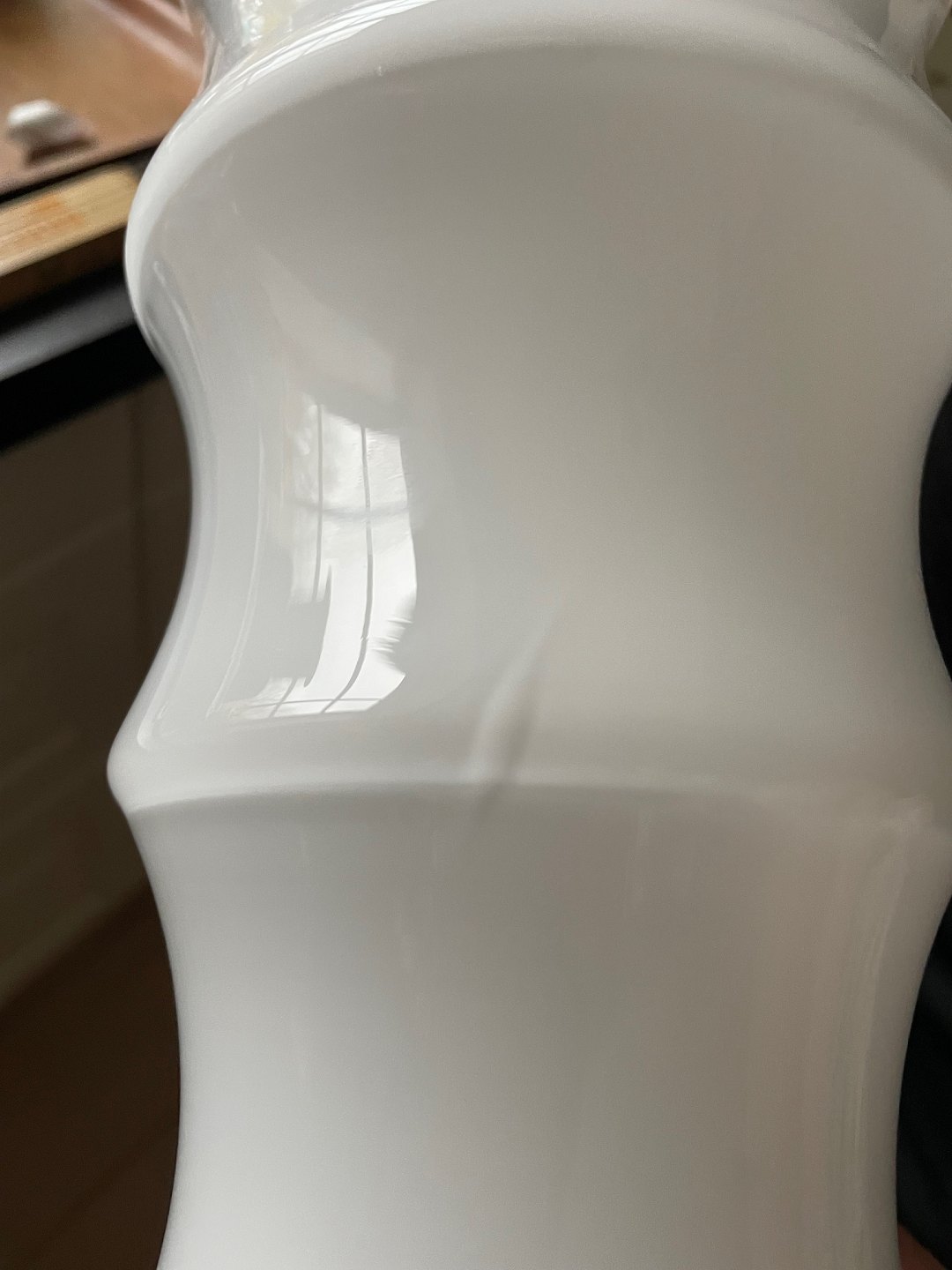 Holmegaard, Karen Blixen opalinehvid vase stor størrelse. Designet af Anja Kjær i 2000. Vasens form er inspireret af afrikanske kvinders hals og armringe. Højde 30,5 cm. Diameter 17,5 cm. OBS der er 2 indvendige produktionsfejl. Den øverste som en revne i glasset, den nederste som en boble, den kan ses udefra. Pris: 400 kr. stk. Lager: 1