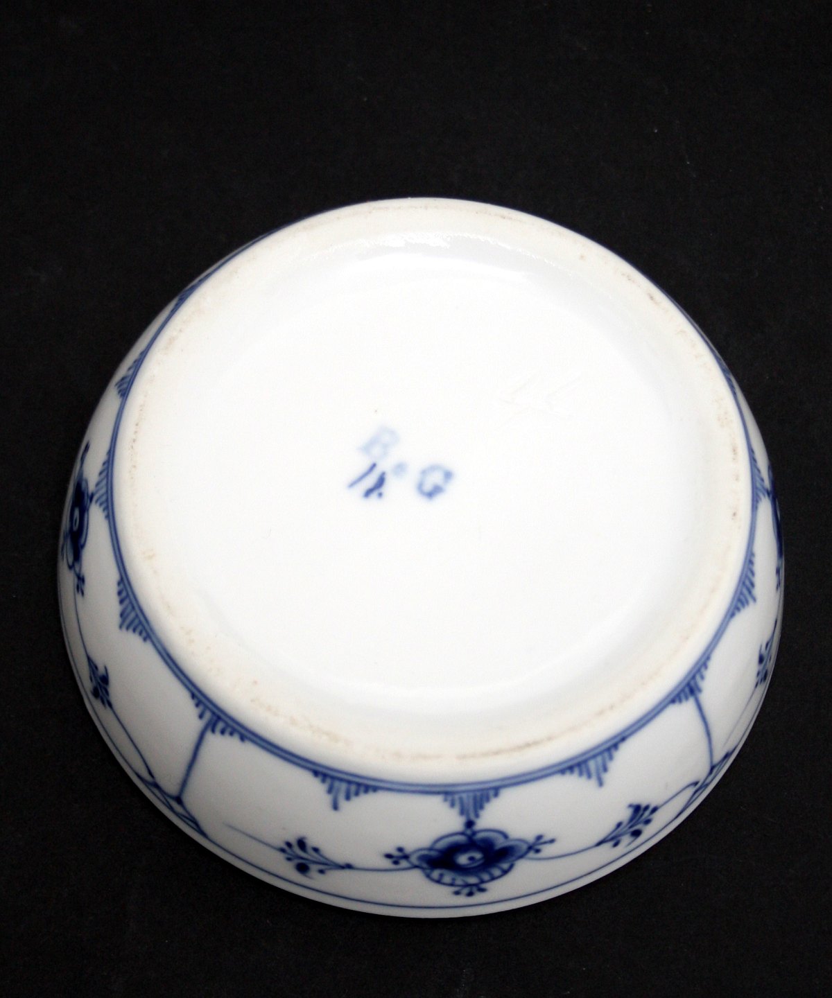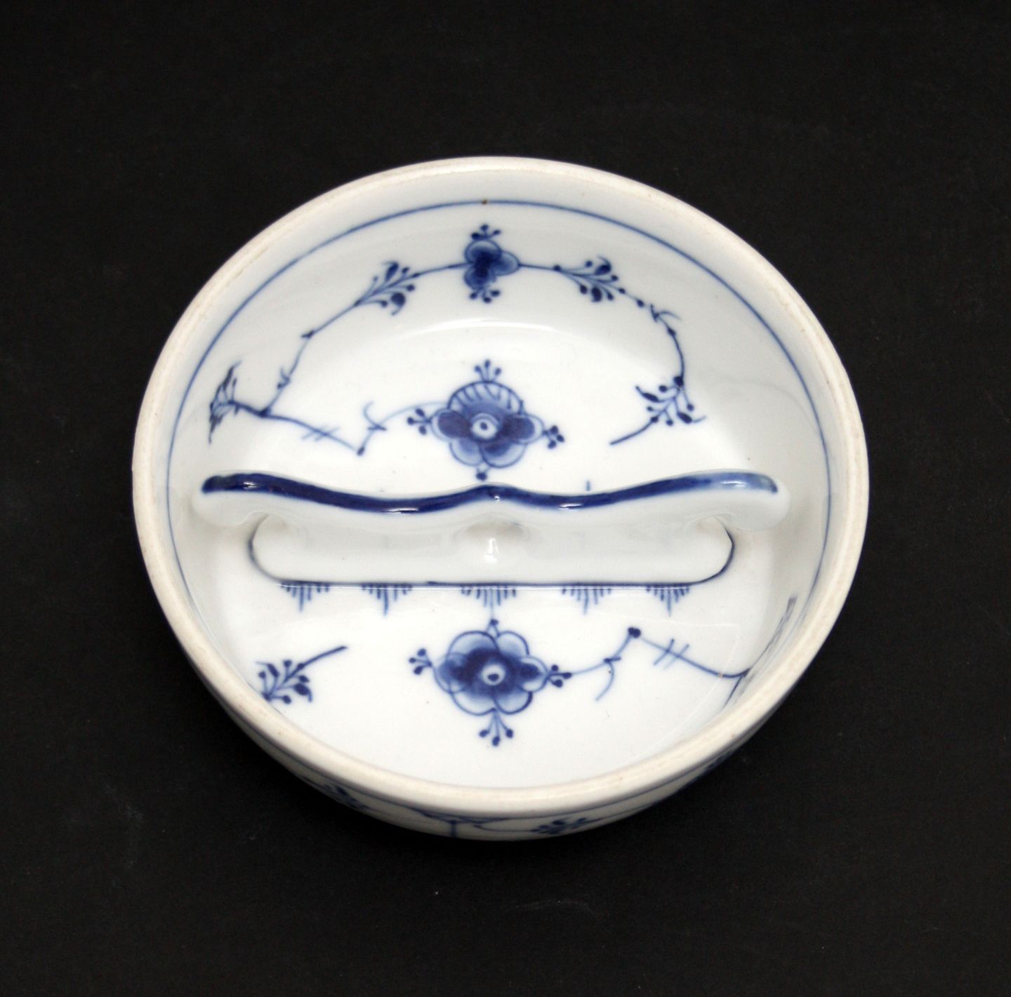 Bing og Grøndahl, Blåmalet (Musselmalet). Pibe eller cigaraskebæger med tværholder. Gammelt B&G mærke produceret før 1915. Højde 3,5 cm. Diameter 10 cm. I. sortering. Perfekt stand. Pris: SOLGT