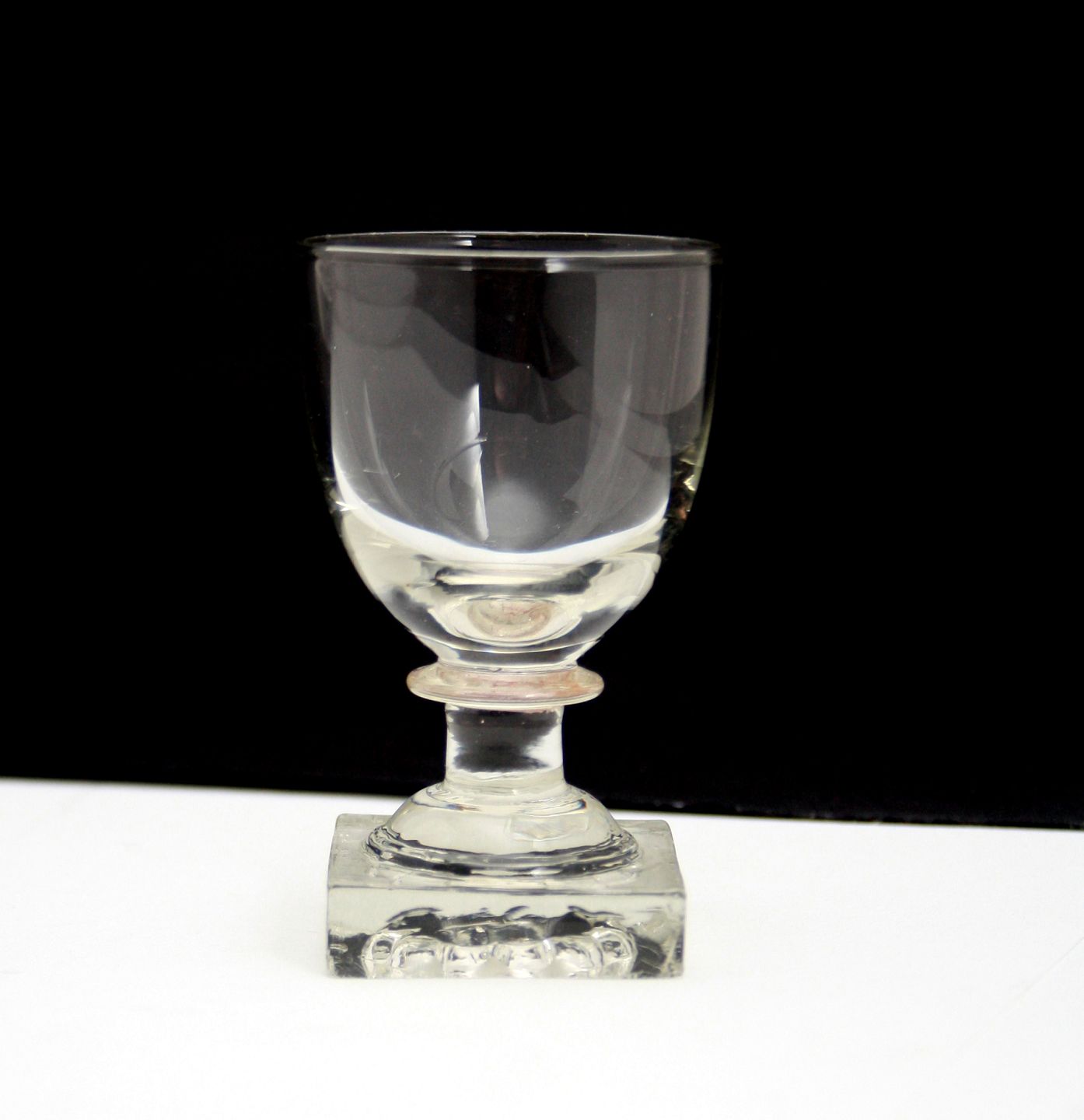 Holmegaard glasværk, Gorm den Gamle/Viking glas med kraftig firkantet slebet fod. Bunden har opstukket "blomst" med runde kronblade. Produceret omkring 1900. Snaps. Højde 7 cm. Diameter 4,5 cm. Enkelte med minimale afslag i bunden af fod. Fin stand. Pris: SOLGT
