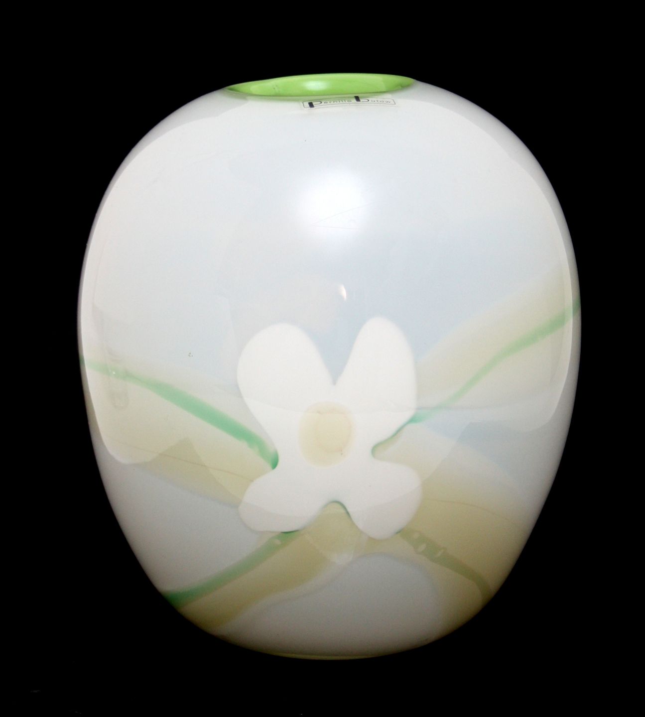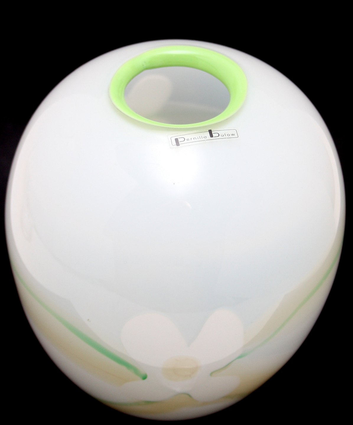 Pernille Bülow, Vase, hvid og mint grøn med blomst motiv. Højde 18 cm. Største diameter 16 cm. Pris: SOLGT