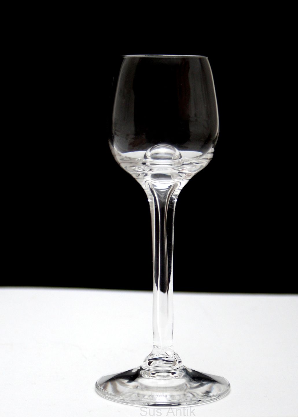 Et højt elegant glas med hul stilk, med en boble i bunden af glasset, et stykke glasmagerkunst. Snaps. Højde 12 cm. Øverste diameter 3 cm. Pris: SOLGT