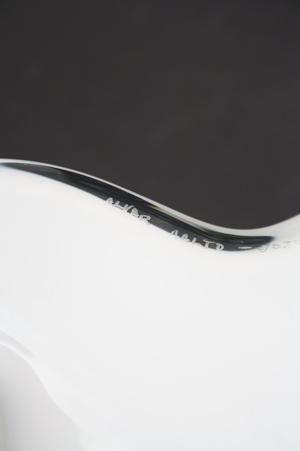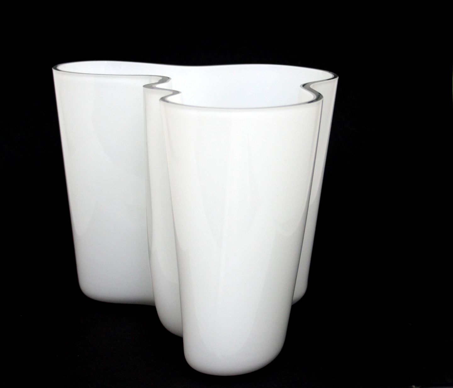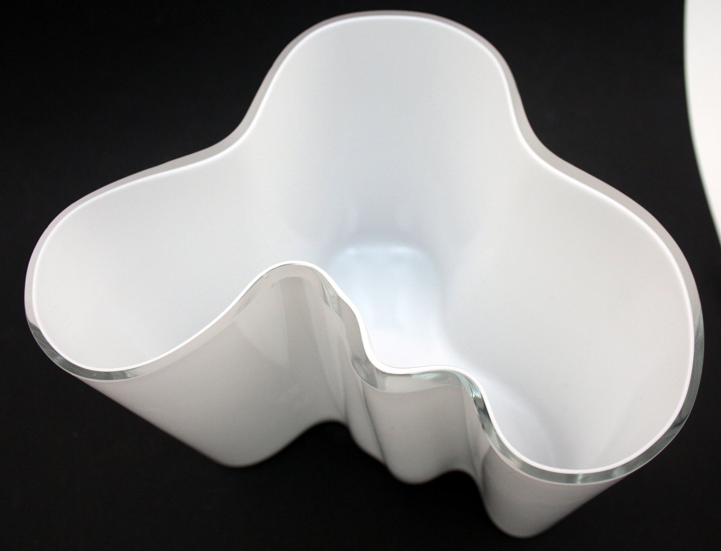 Iittala, Finland, Savoy vase i opal hvid og klar glas. Designet af Alvar Aalto. Ældre model med indgraveret signatur og modelnr 3031, den er tungere end de nyere. Lille mikroskopisk chip afslag, se ekstra foto. Højde 16 cm. Pris: SOLGT