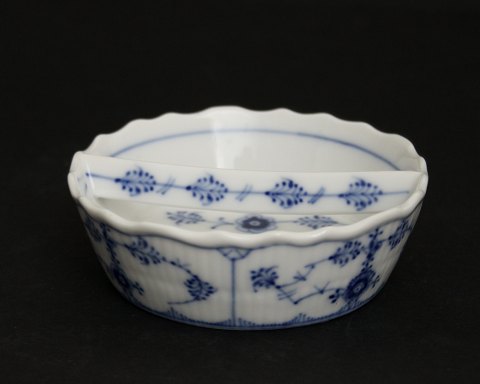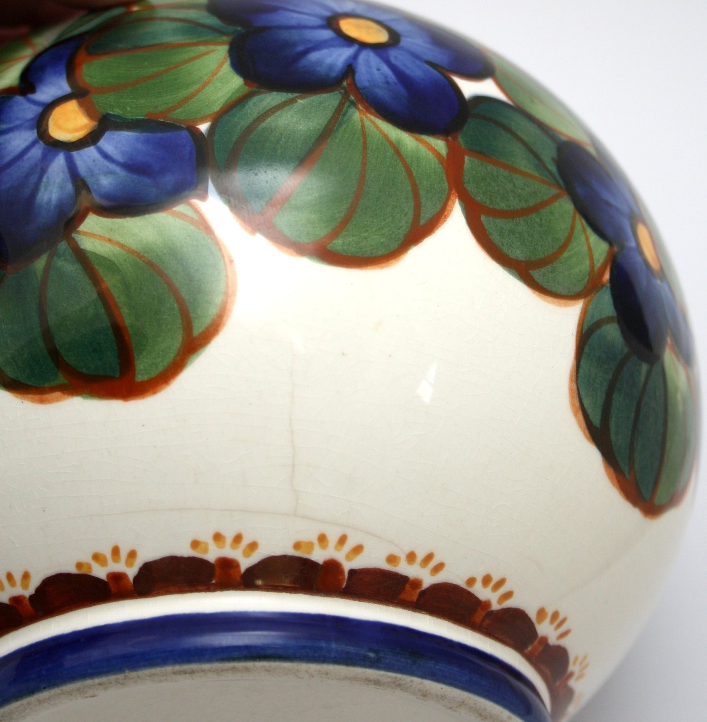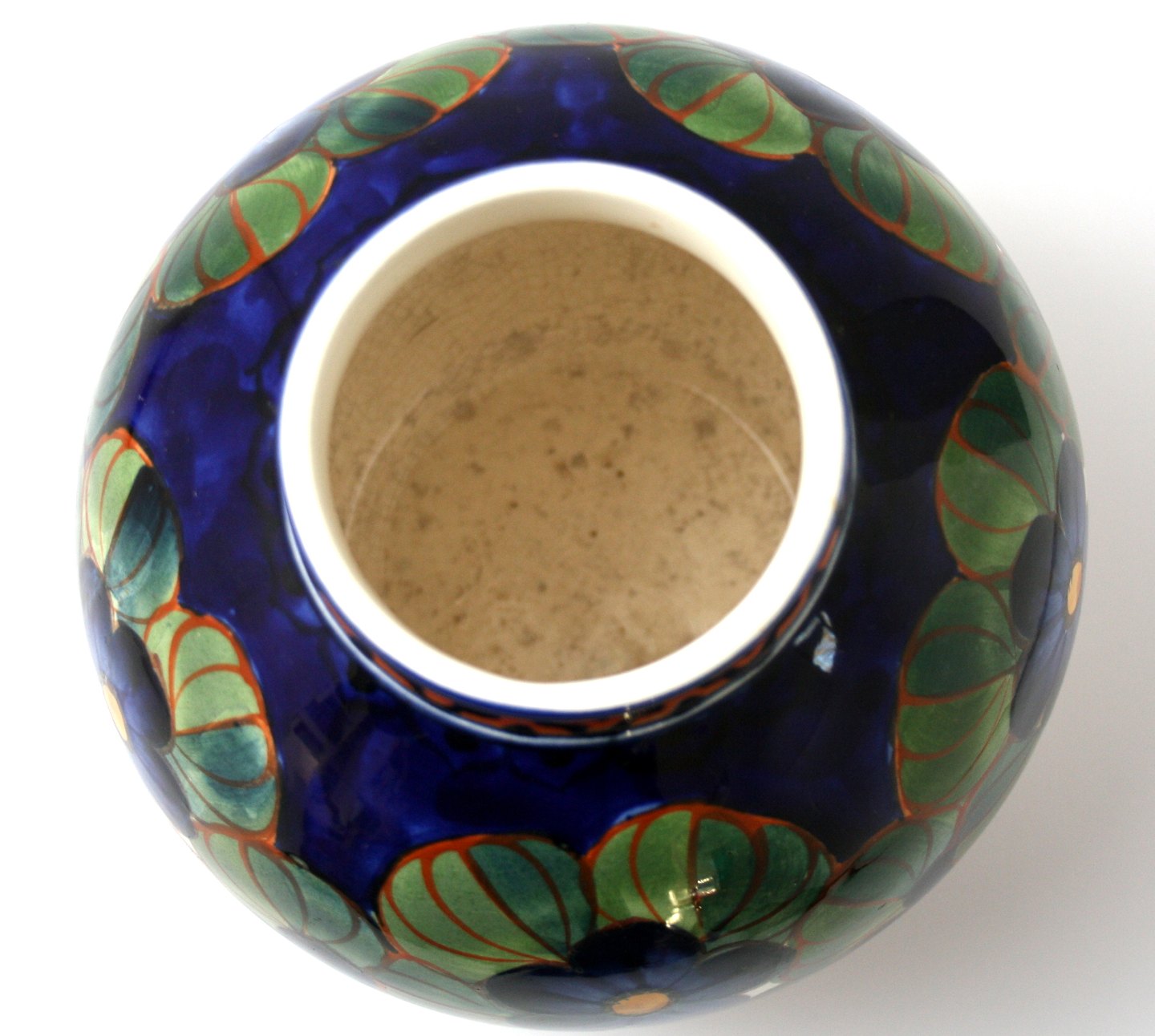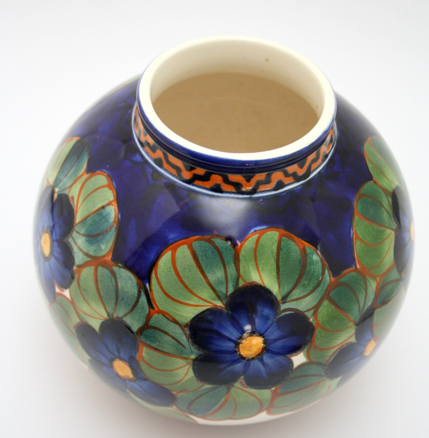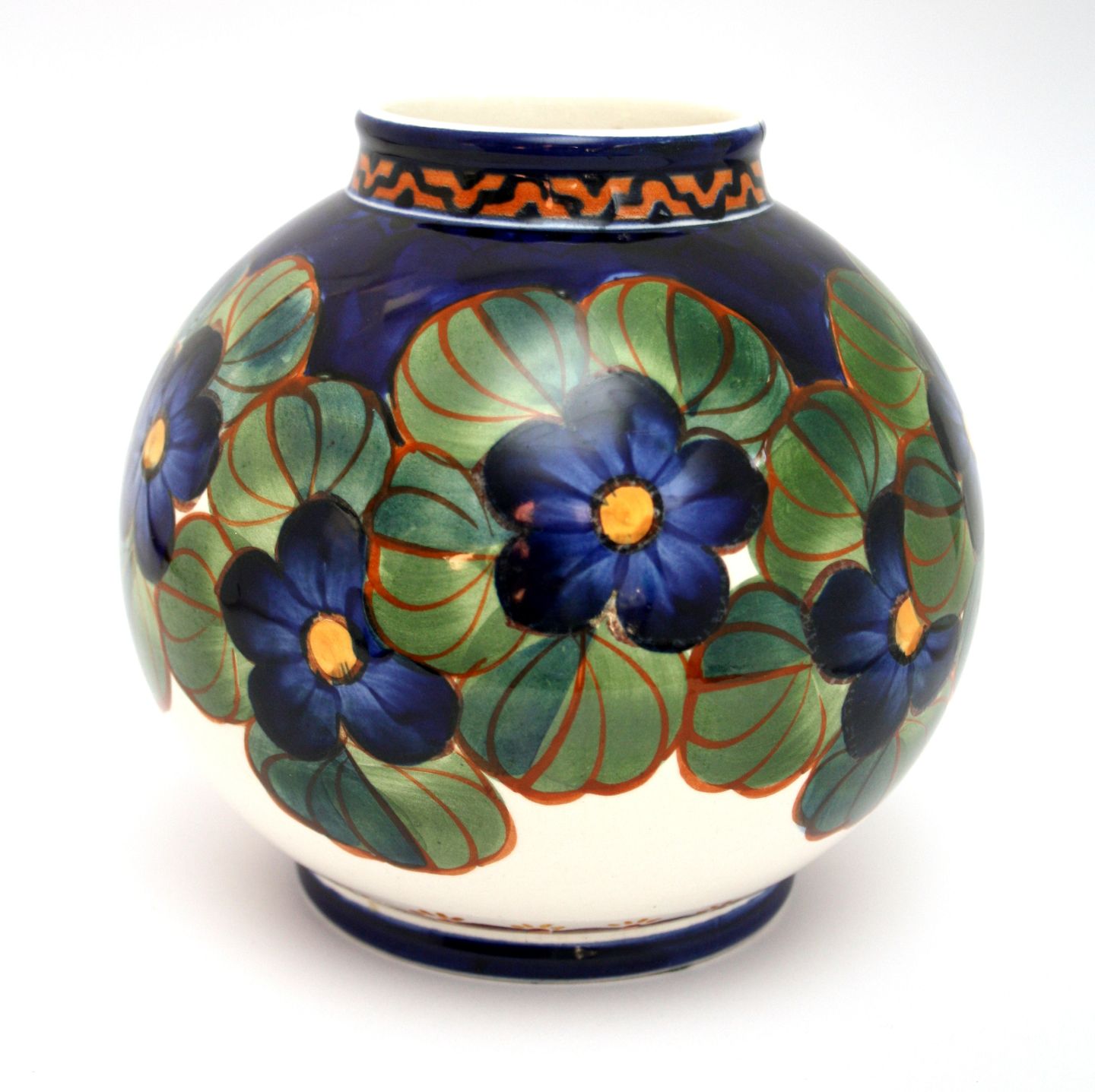 Aluminia, Kugle vase, rund vase fra skønvirkeperioden dekoration "Heibergs blå blomster." Designet af Harald Slott-Møller i 1912. Nr. 838/431. Højde 16 cm. Største diameter ca. 14 cm. Fin stand med overfladekrakeleringer, hårrevne se foto, men ingen afslag. Pris: SOLGT