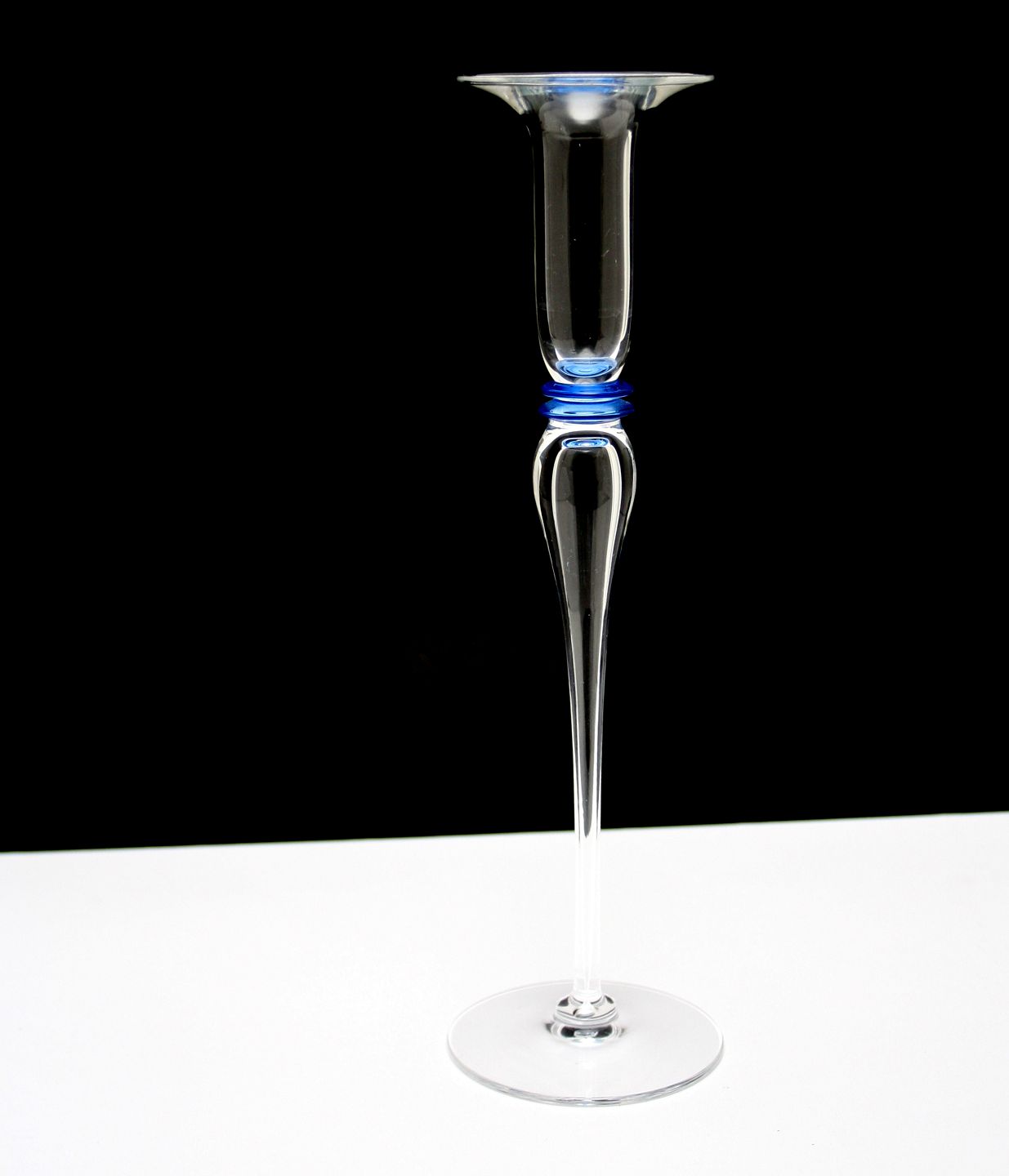 Holmegaard, Attica, Lysestage mellemstørrelse, klar glas med blå knop. Designet af Anja Kjær i 1989 udgår af produktion i 2002. Højde 25,6 cm. Pris: SOLGT