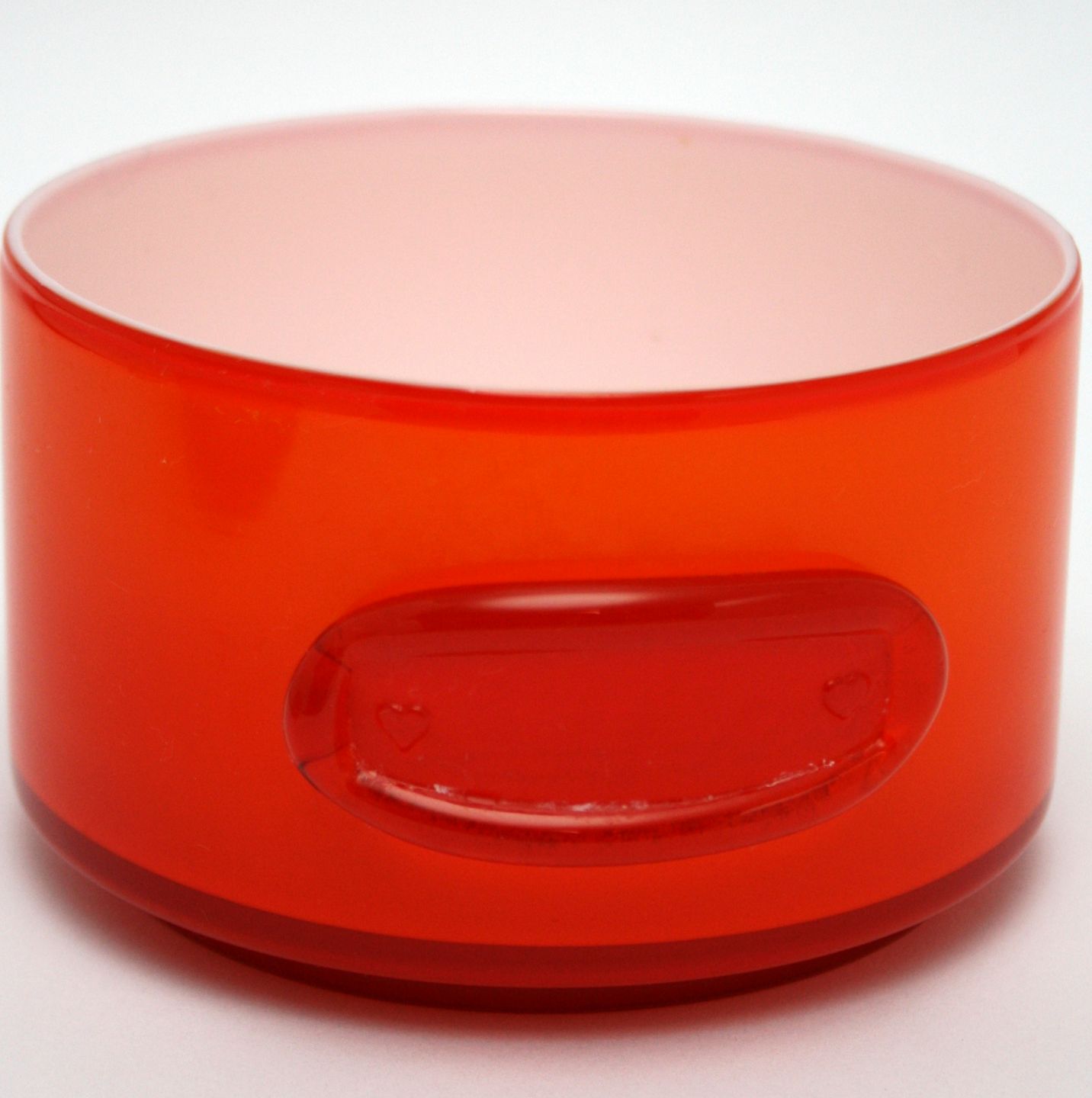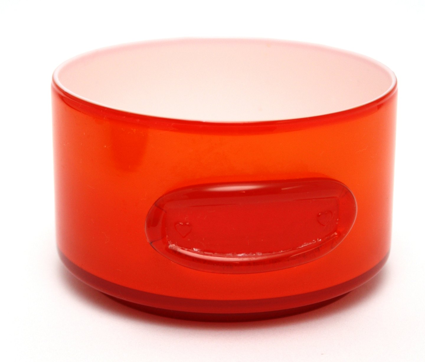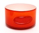 Holmegaard, Palet, Orangerød køkkenserie. Skål til opbevaring med blank neutral etikette. Designet af Michael Bang i 1969, udgår i 1976. Højde 7 cm. Diameter 11,2 cm. Pris: SOLGT