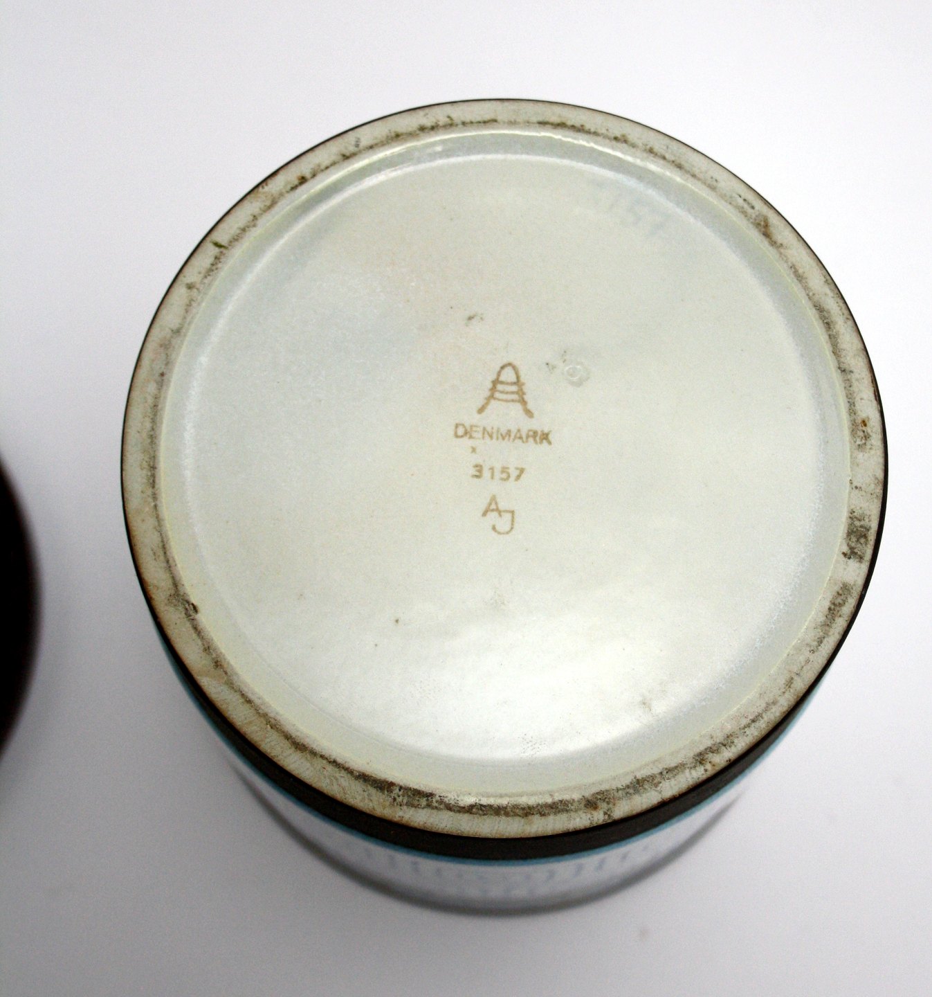 Aluminia, Thule kunstfajance med begittet brun skærv og lyseblå mønster på hvid bund. Designet af Anni Jeppesen i 1962.