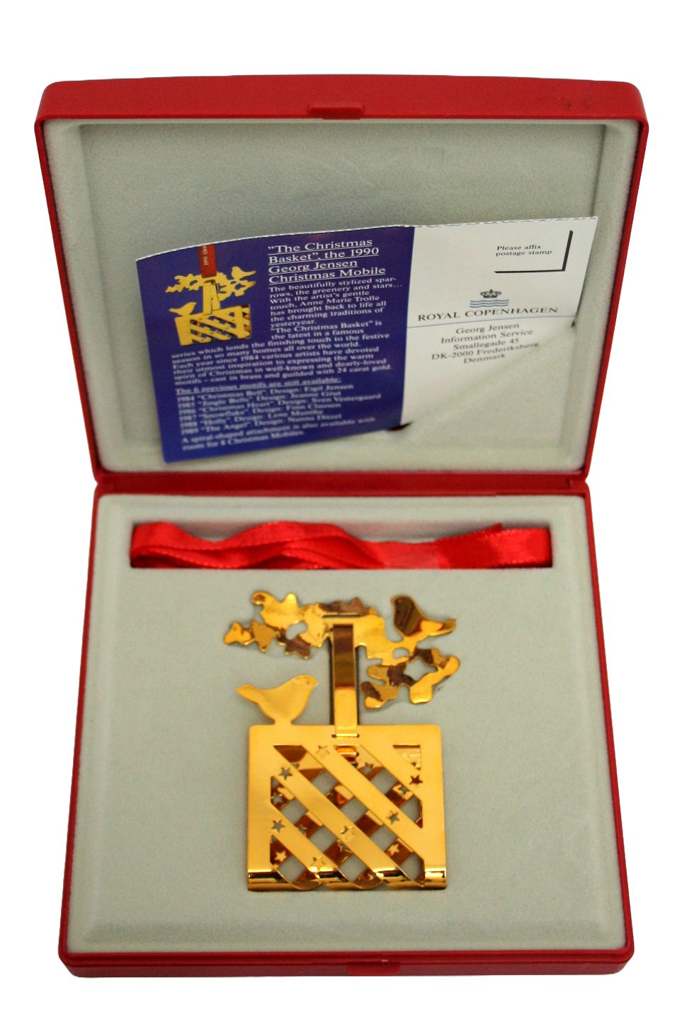 Georg Jensen, Juleuro 1990 Julekurven designet af kunstner Anne Marie Trolle. Juleuroen er udført i messing belagt med 24 karat guld. OBS det er ikke det originale silkebånd, gaveæske medfølger. Pæn og velholdt stand. Pris: SOLGT