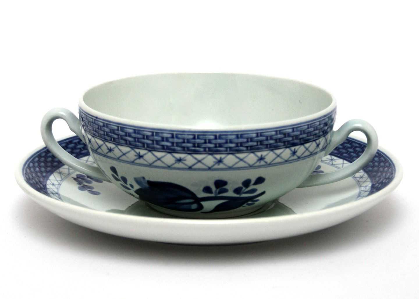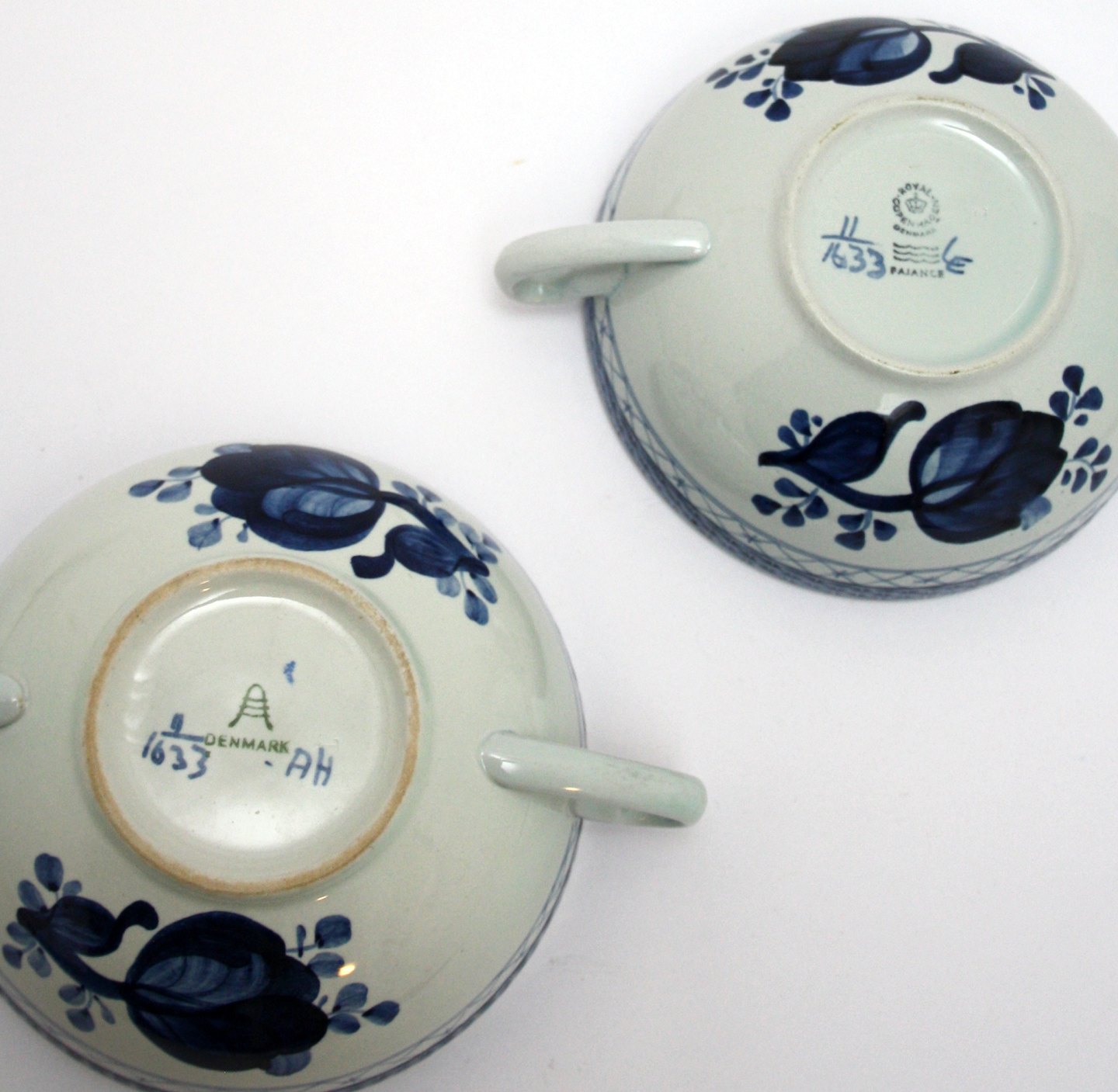 Boullionkop med underkop. Både Royal Copenhagen og Aluminia. Nr. 11/1633. Højde ca. 5,5 cm. Diameter 13 cm. Underkop diameter 19 cm. Fin stand med meget lidt brugsslid. Pris: SOLGT