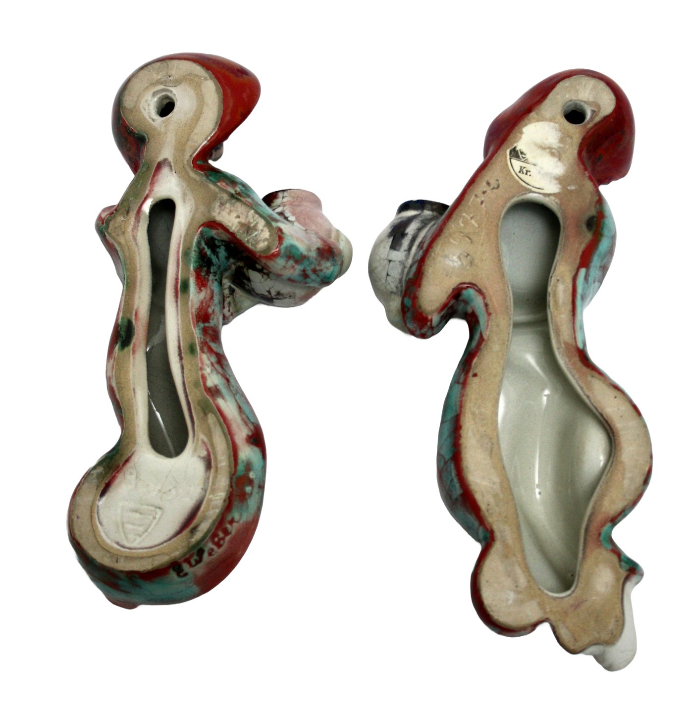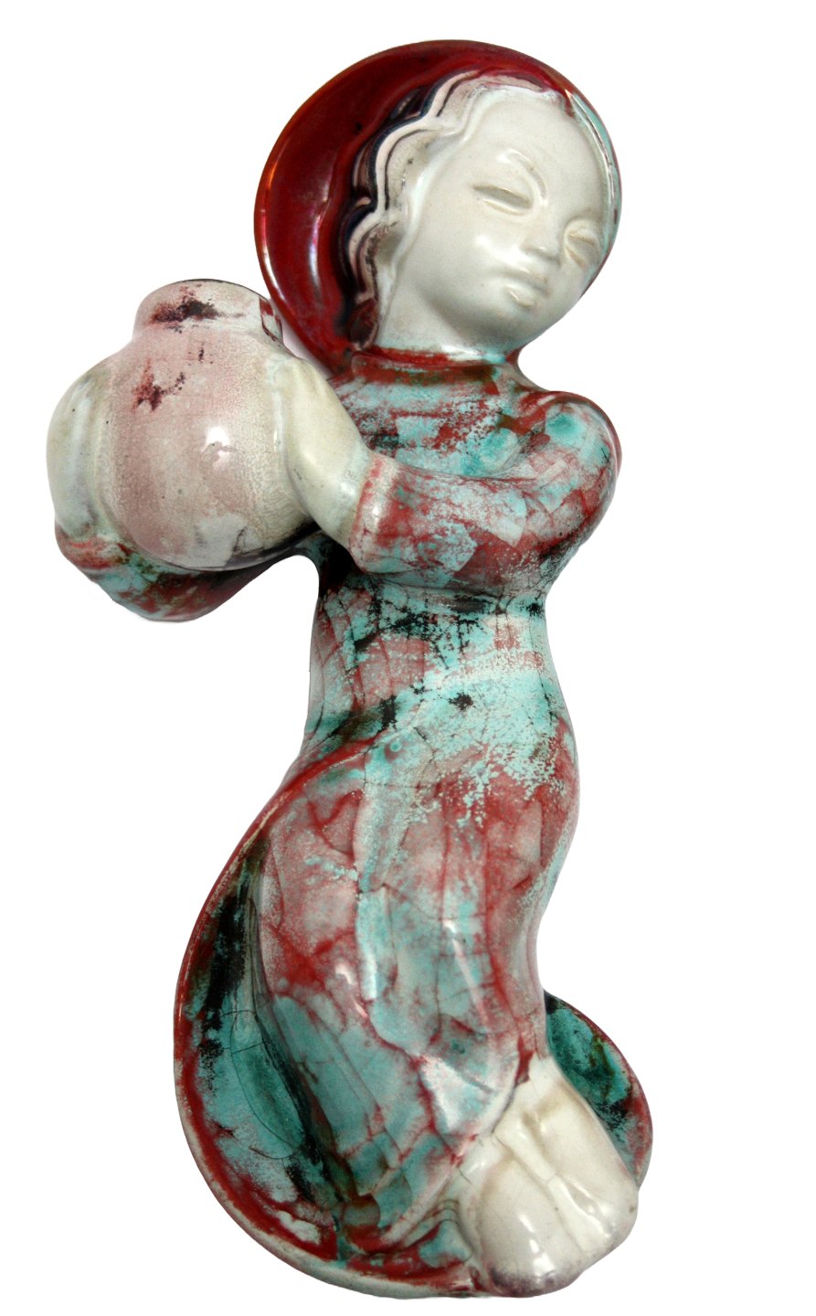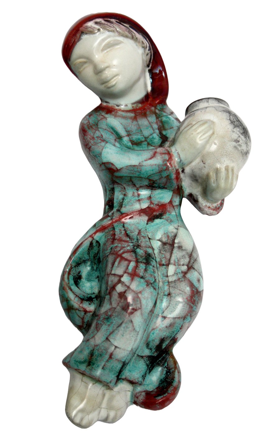 Michael Andersen, Bornholm, Relief figurer til ophæng pige og dreng med krukker. Persia glasur. Pige 22 cm. Dreng 24 cm. Flot stand. Sælges som sæt. Pris: SOLGT