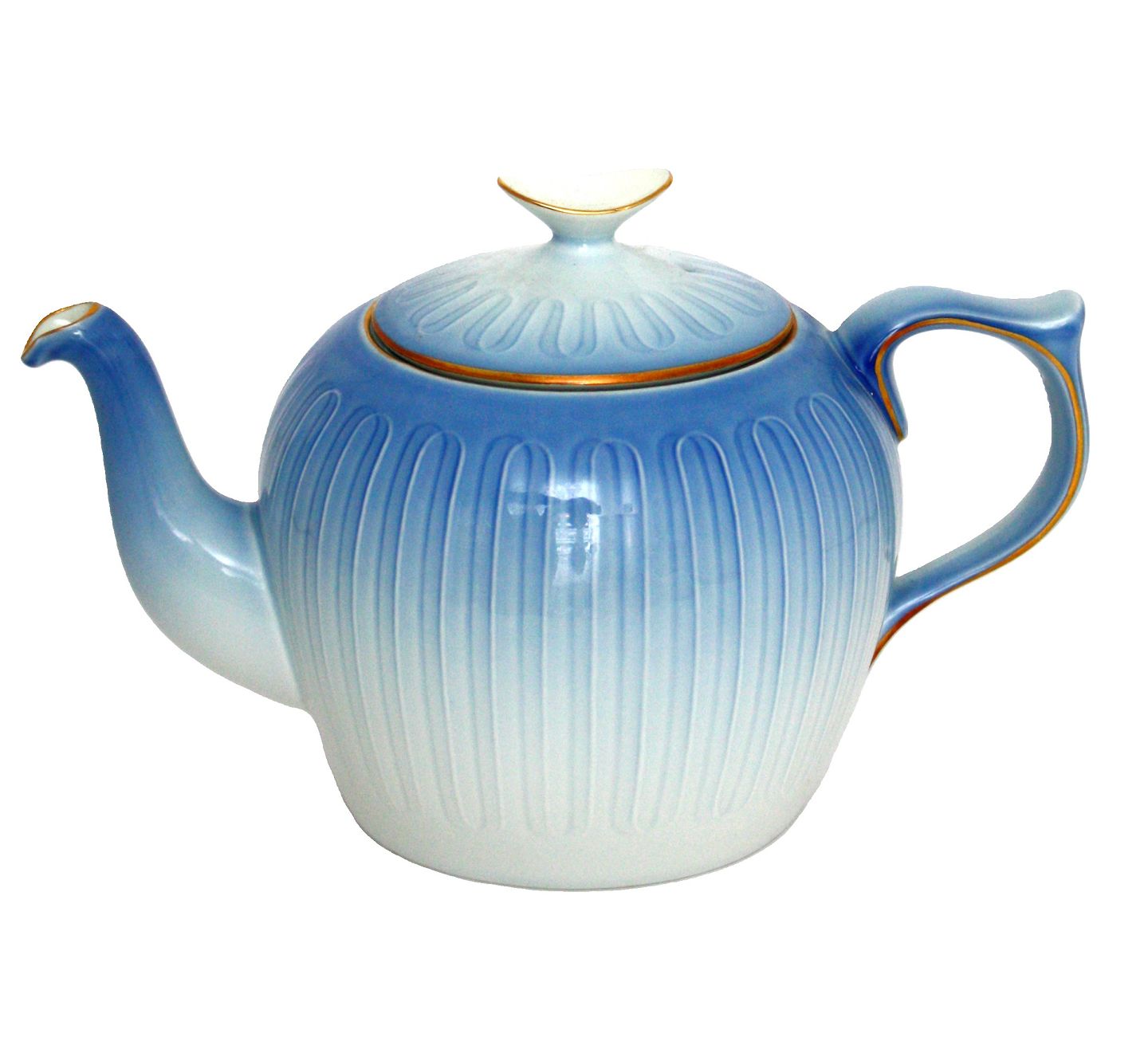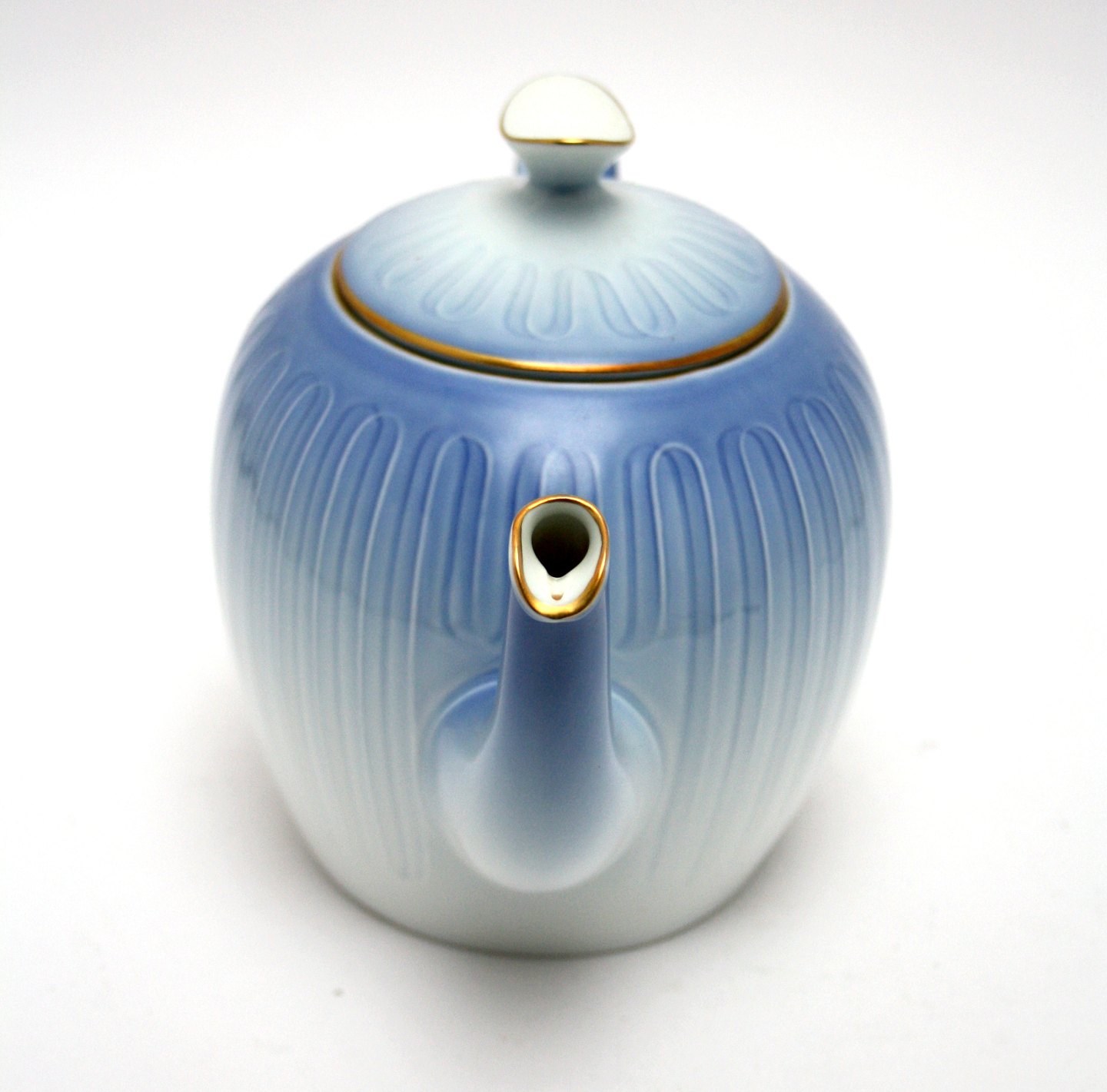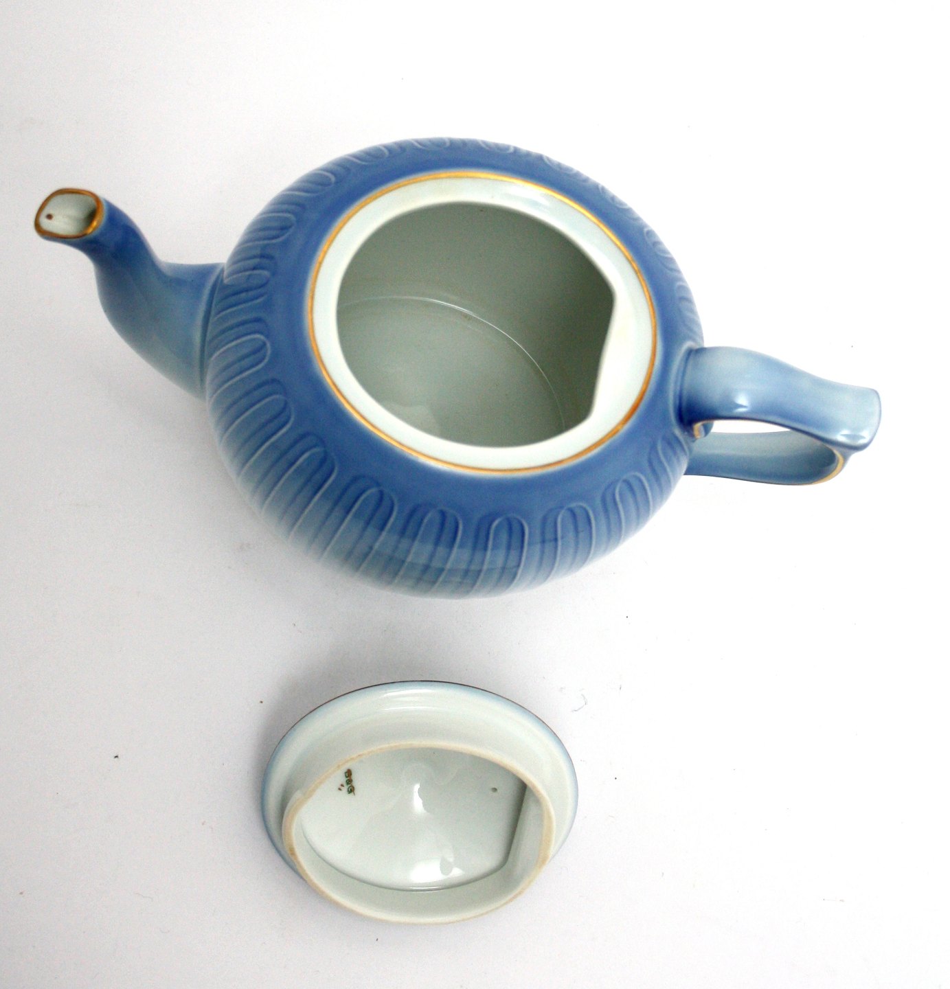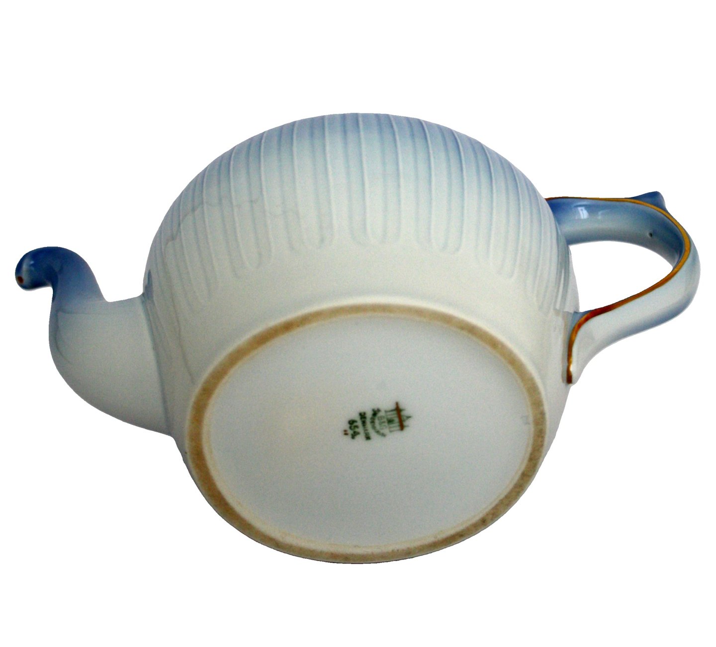Bing & Grøndahl, Ballerina med guld, Lyseblåt porcelæn med guldkant. Tekande. Nr. 654. II. sortering. Højde 14 cm. Længde 23 cm. Pris: SOLGT