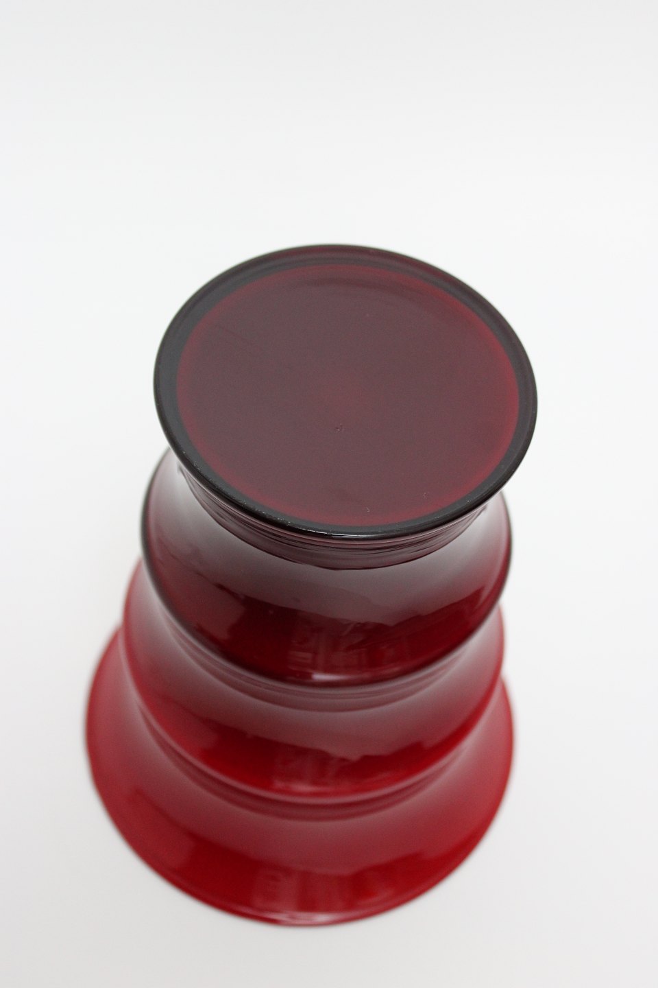 Holmegaard, Karen Blixen rød vase, støvet rosa indvendig. Designet af Anja Kjær fra 2000. Ikke signeret. Vasens form er inspireret af afrikanske kvinders hals og armringe. II. sortering, produktionsfejl indvendig i vasen. Højde 17 cm. Diameter 14 cm. Pris: SOLGT