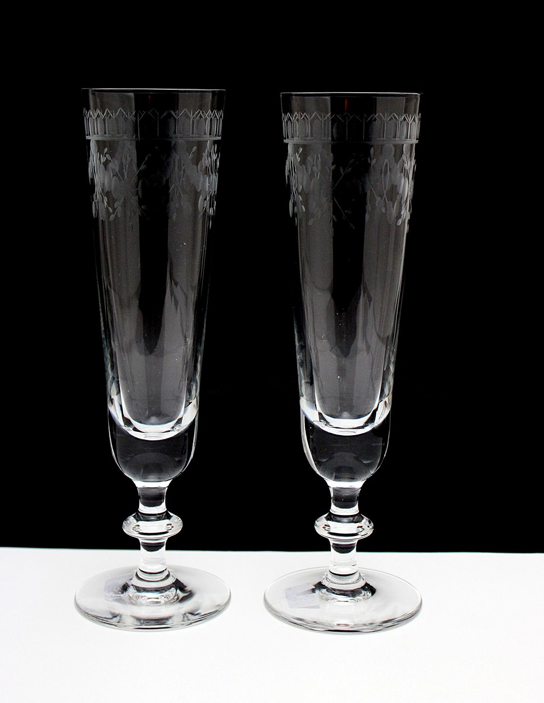 Krystal Champagnefløjter Roland graveret med ranker og guirlande bånd. Højde 19,5 cm. Diameter øverst 5,2 cm. Pris: SOLGT