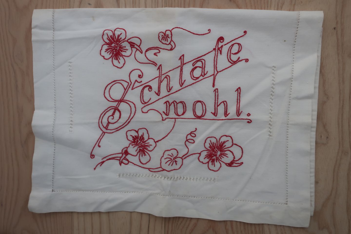 Pudevår med håndbroderet tekst: "Schlafe wohl"