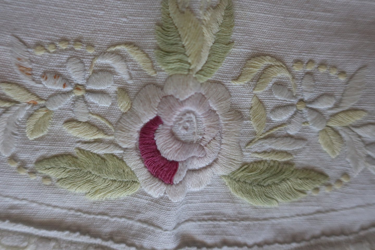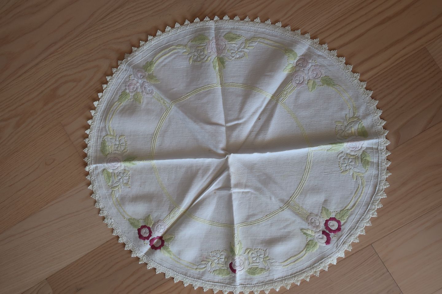 Old table cloth With embroidery in colours - made by hand Diam: about 60 cm In a good condition, but best to wash it Articleno.: DG84