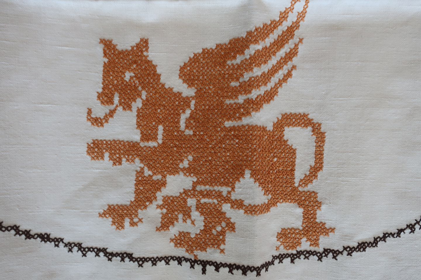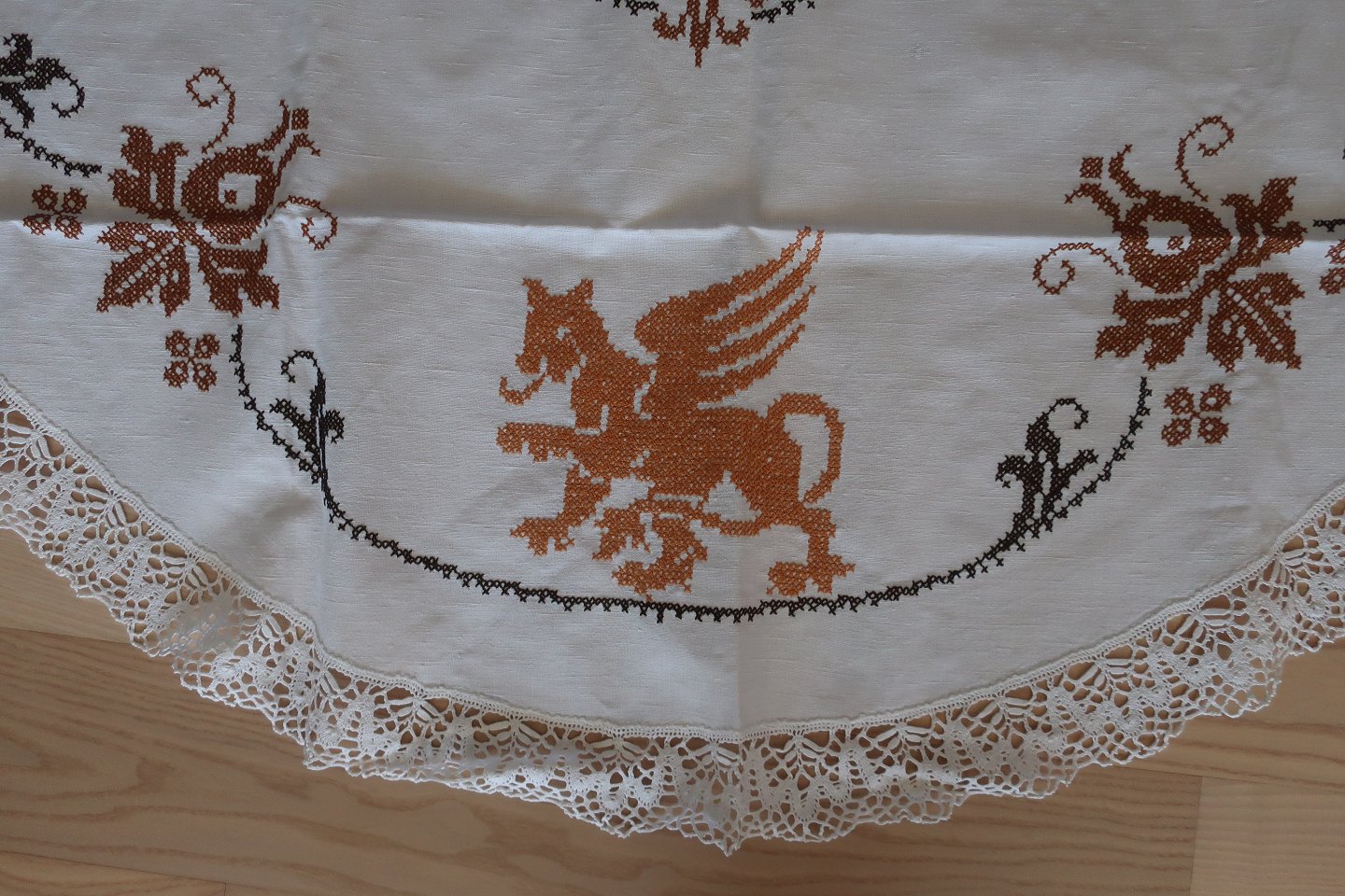 Old table cloth With embroidery in colours - made by hand Diam: 128cm In a good condition Articleno.: DG103